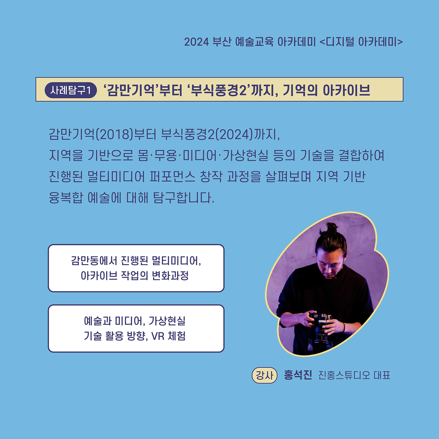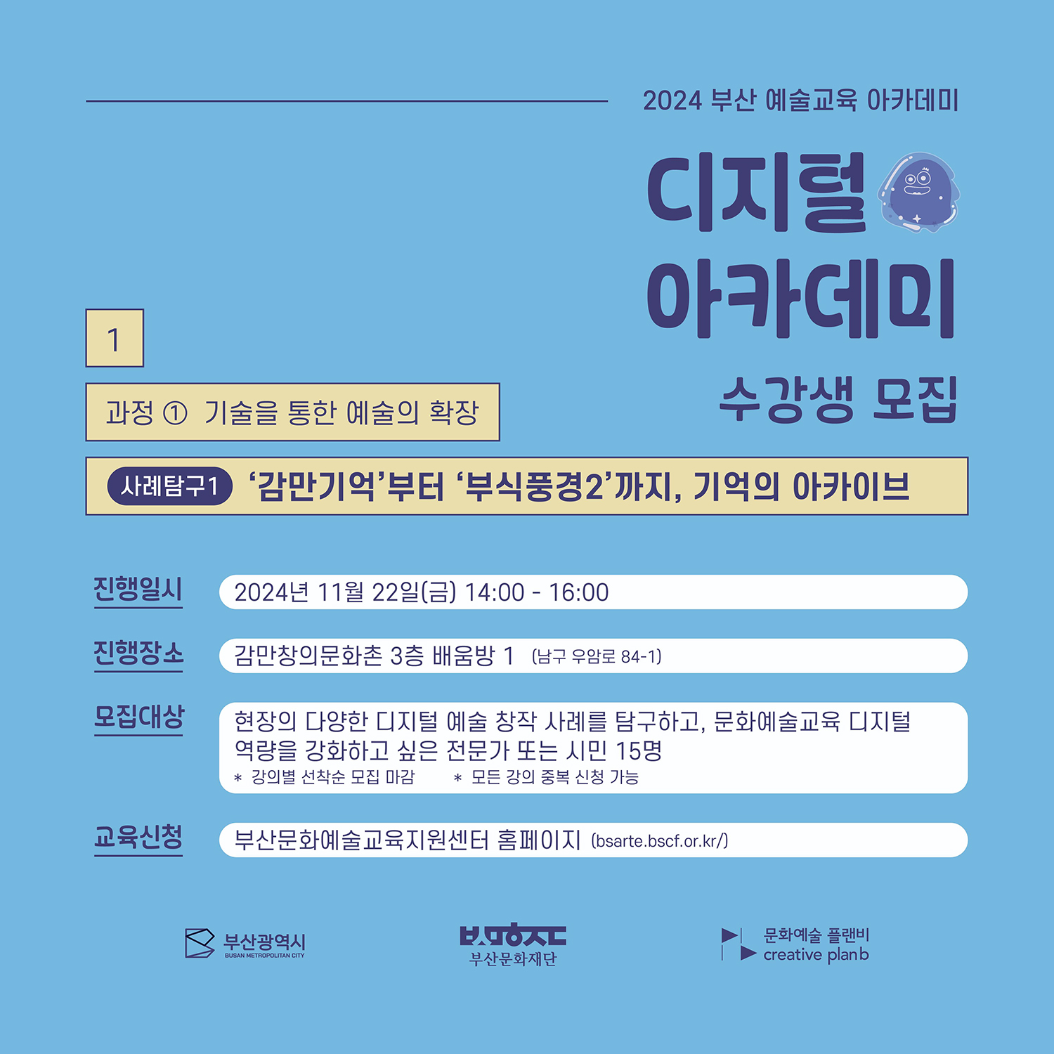 2024 부산예술교육 아카데미는 문화예술교육 활동가로서의 통합적 역량을 강화하고, 새로운 지역형 문화예술교육 프로그램을 발굴, 확산하기 위한 예술교육 프로그램입니다. <디지털 아카데미>는 문화예술교육 관련 전문가 또는 이에 관심 있는 시민들을 대상으로 하는 교육 프로그램으로, 11월 22일(금)에서 24일(일)까지 3일간 6개의 프로그램이 진행됩니다. 첫 번째 디지털 아카데미인 <과정1. 기술을 통한 예술의 확장 : ‘감만기억’부터 ‘부식풍경2’까지, 기억의 아카이브>는 멀티미디어 퍼포먼스 창작 과정을 살펴보며 지역 기반 기술 융복합 예술에 대해 탐구하는 예술교육 프로그램입니다. - 일시: 2024. 11. 22.(금) 14:00 ~ 16:00 - 장소: 감만창의 문화촌 3층 배움방1(남구 우암로 84-1) - 대상: 현장의 다양한 디지털 예술 창작 사례를 탐구하고, 문화예술교육 역량을 강화하고 싶은 전문가 또는 시민 15명 - 신청: 부산문화예술교육지원센터 홈페이지(bsarte.bscf.or.kr) - 비용: 무료 - 문의: 문화예술 플랜비 051-622-6200 *신청확인 및 교육안내 등은 11/21(목)에 문자로 일괄 안내 예정입니다.