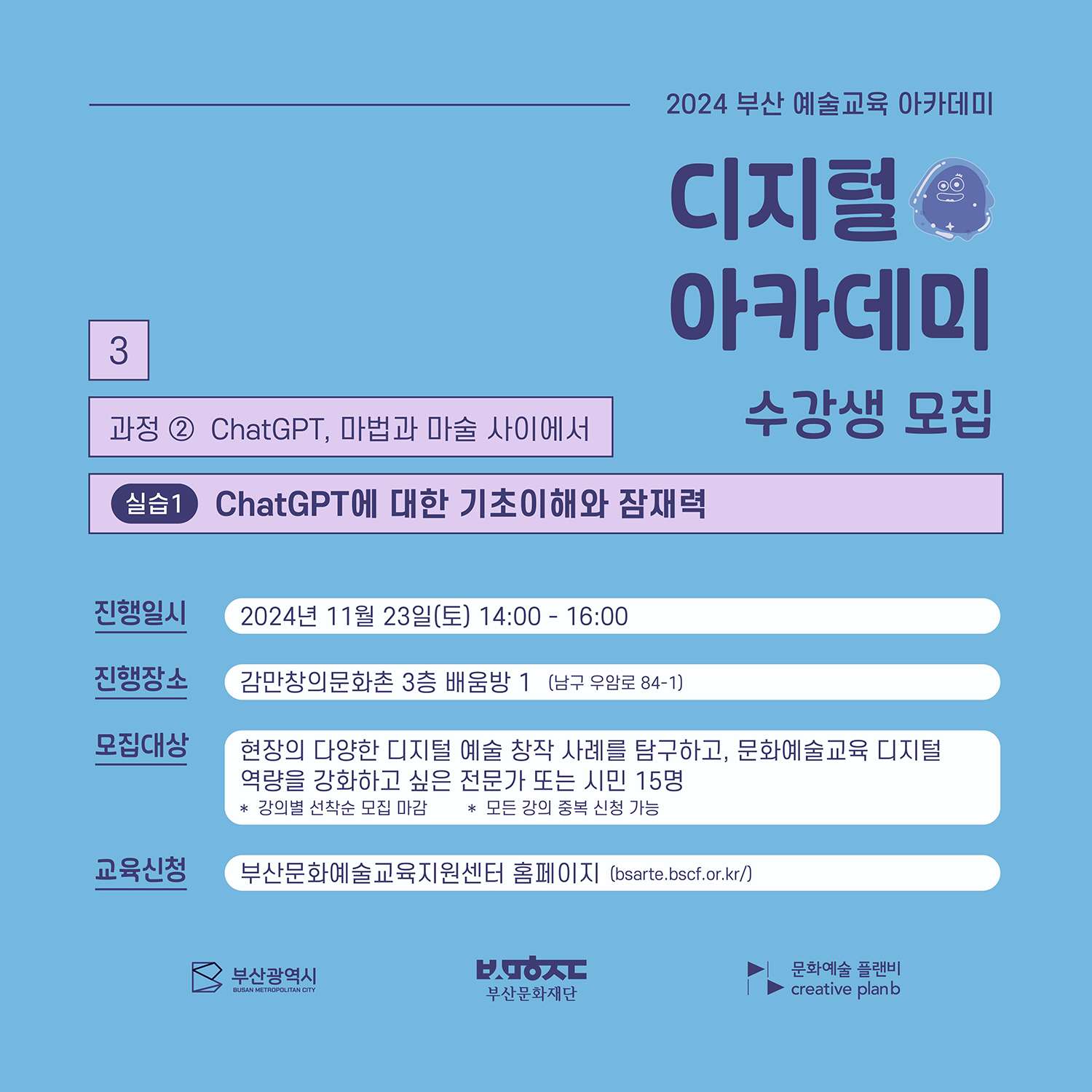 2024 부산예술교육 아카데미는 문화예술교육 활동가로서의 통합적 역량을 강화하고, 새로운 지역형 문화예술교육 프로그램을 발굴, 확산하기 위한 예술교육 프로그램입니다. <디지털 아카데미>는 문화예술교육 관련 전문가 또는 이에 관심 있는 시민들을 대상으로 하는 교육 프로그램으로, 11월 22일(금)에서 24일(일)까지 3일간 6개의 프로그램이 진행됩니다. 세 번째 디지털 아카데미인 <과정2. 챗GPT, 마법과 마술 사이에서 : ChatGPT에 대한 기초이해와 잠재력>은 ChatGPT로 제작한 예술작품을 살펴보고 text to image 모델을 직접 사용해 보는 예술교육 프로그램입니다. - 일시: 2024. 11. 23.(토) 14:00 ~ 16:00 - 장소: 감만창의 문화촌 3층 배움방1(남구 우암로 84-1) - 대상: 현장의 다양한 디지털 예술 창작 사례를 탐구하고, 문화예술교육 역량을 강화하고 싶은 전문가 또는 시민 15명 - 신청: 부산문화예술교육지원센터 홈페이지(bsarte.bscf.or.kr) - 비용: 무료 - 문의: 문화예술 플랜비 051-622-6200 *신청확인 및 교육안내 등은 11/21(목)에 문자로 일괄 안내 예정입니다.