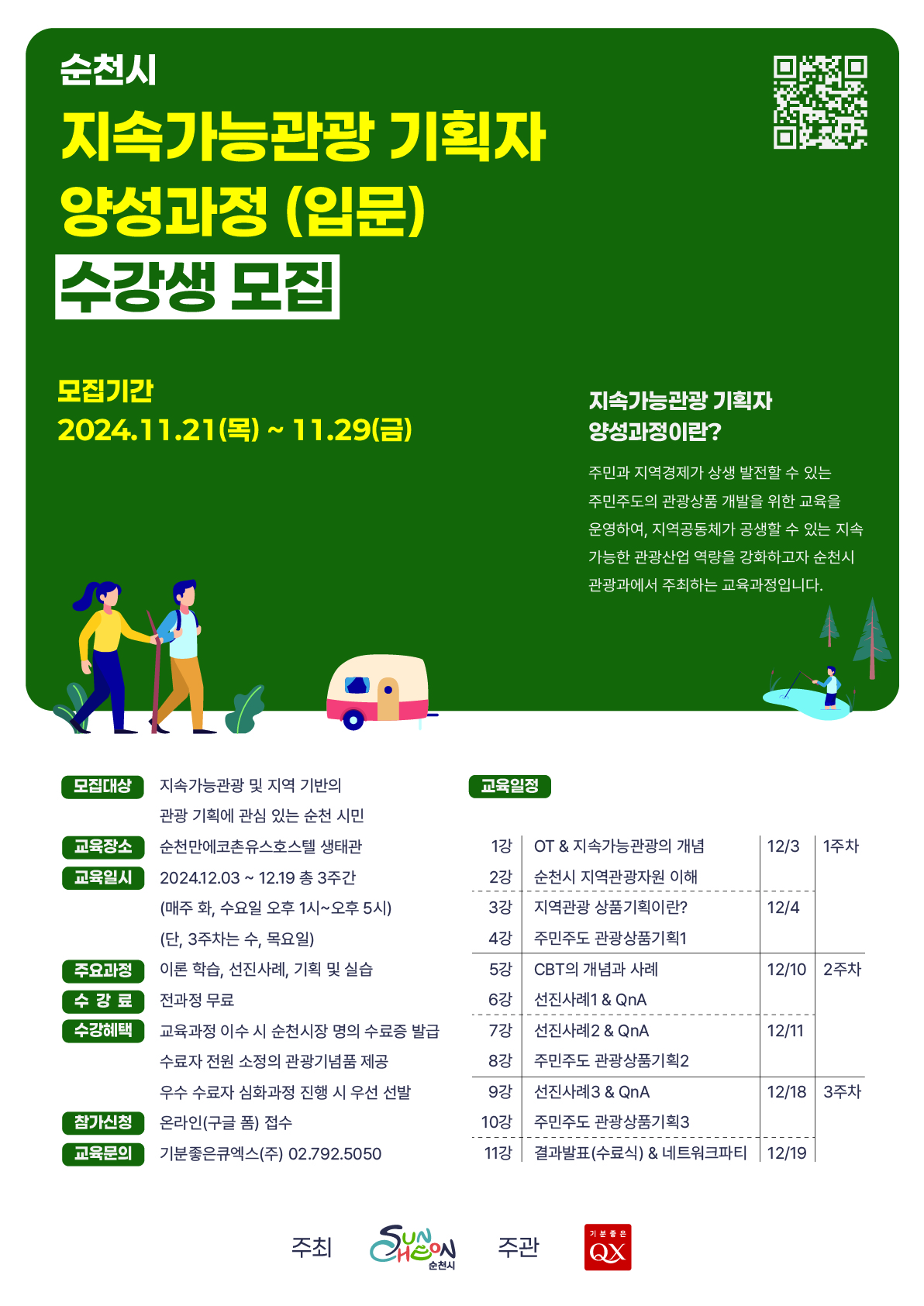 - 모집대상 : 지속가능관광 및 지역 기반의 관광 기획에 관심 있는 순천 시민 - 교육장소 : 순천만에코촌유스호스텔 생태관 - 교육일시 : 2024.12.03 ~ 12.19 총 3주간 (매주 화, 수요일 오후 1시~오후 5시) (단, 3주차는 수, 목요일) - 주요과정 : 이론 학습, 선진사례, 기획 및 실습 수강료 : 전과정 무료 - 수강혜택 : 교육과정 이수 시 순천시장 명의 수료증 발급 수료자 전원 소정의 관광기념품 제공 우수 수료자 심화과정 진행 시 우선 선발