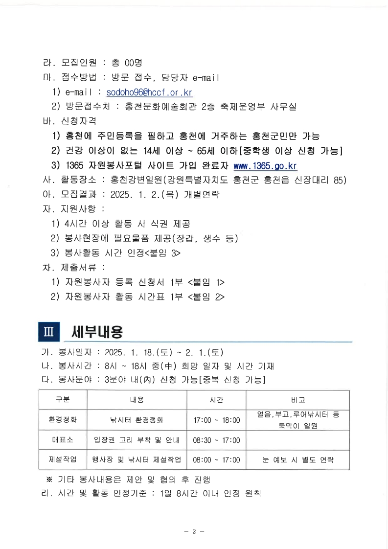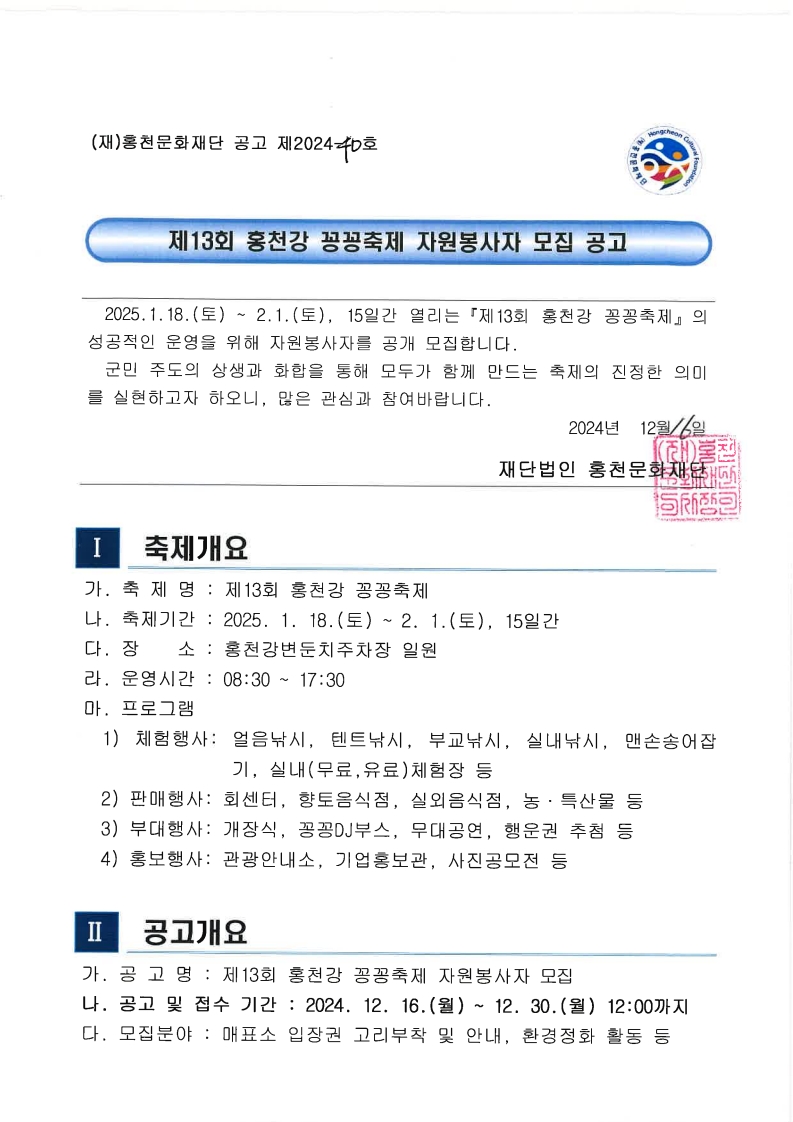 | 제13회 홍천강 꽁꽁축제 자원봉사자 모집 공고 | |||