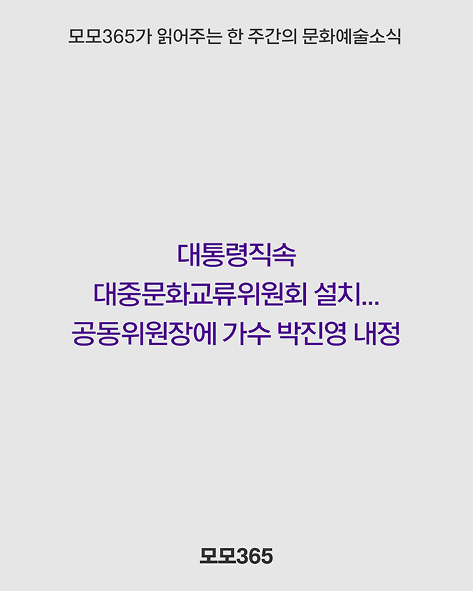 모모365가 읽어주는 한 주간의 문화예술 소식 매주 초, 모모365가 한 주간의 문화예술 소식을 엄선해 읽어드립니다! 나에게 필요한 모든 문화예술 정보, 모모365에서 편리하게 확인하세요! *본 콘텐츠는 노원문화재단 문화진흥부의 도움으로 제작하였습니다.* -기사 전문 링크- 1. 대통령직속 대중문화교류위원회 설치... 공동위원장에 가수 박진영 내정 2. 뉴욕 메트로폴리탄 오페라 최악의 재정 위기, 사우디와 손잡은 '피터 갤브'… 최대 2779억 협약 https://v.daum.net/v/20250907141046164 3. 지휘자 취소·할리우드 서명…문화예술계 이스라엘 보이콧 확산 https://v.daum.net/v/20250912122815693 4. 2024년 성인 독서율 87.8%, 종이책 80.4%로 1위…영상 시청시간이 독서의 약 3배 https://v.daum.net/v/20250908133514994