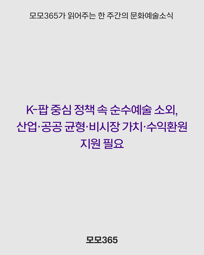 2. K-팝 중심 정책 속 순수예술 소외, 산업·공공 균형·비시장 가치·수익환원 지원 필요 http://m.ithemove.com/news/articleView.html? idxno=4371&fbclid=IwY2xjawNYVxpleHRuA2FlbQIxMQABHts28G2vVVlZ8kaOhspA4Sv0KCzAj TbpnkWGiptcdT1HvdYJtocH8Dk1AlJS_aem_T-jDp3ZBnLn1lvA9EkMUCg