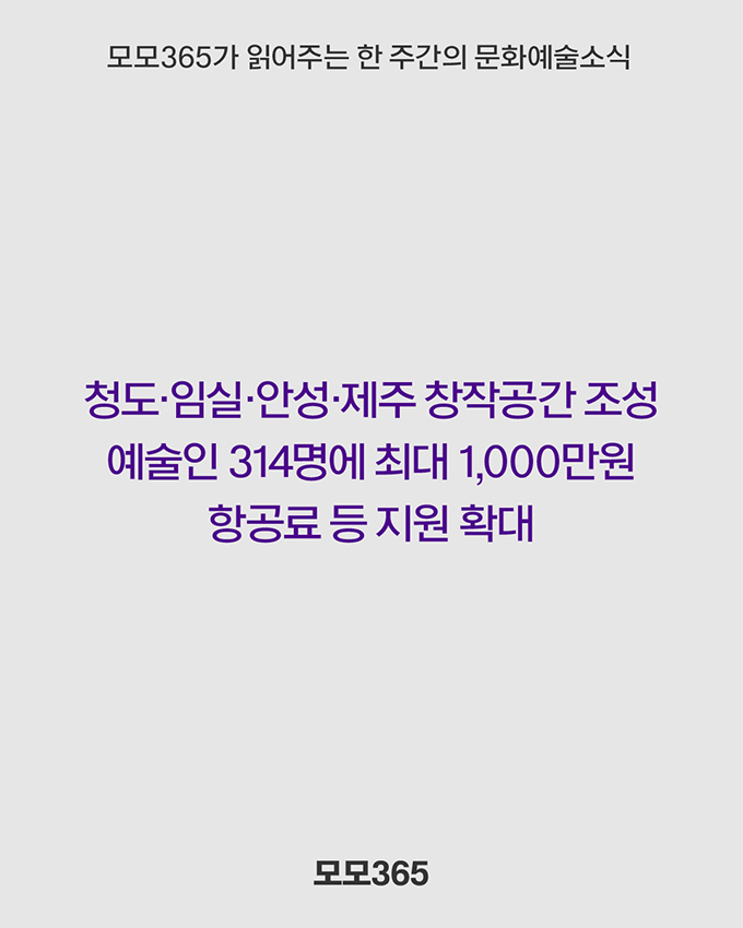 5. 청도·임실·안성·제주, 창작공간 조성·예술인 314명에 최대 1,000만원·항공료 등 지원 확대 https://www.msn.com/ko-kr/news/other/%EB%AC%B8%ED%99%94%EC%98%88%EC%88%A0%EC%9D%B8- %EB%AA%A8%EC%8B%9C%EA%B8%B0-%EC%A0%84%EC%9F%81- %EC%A7%80%EC%9E%90%EC%B2%B4- %EC%B0%BD%EC%9E%91%EA%B3%B5%EA%B0%84- %ED%9B%84%EC%9B%90%EA%B8%88%EC%9C%BC%EB%A1%9C- %EC%8A%B9%EB%B6%80/ar-AA1NIfa3?ocid=socialshare