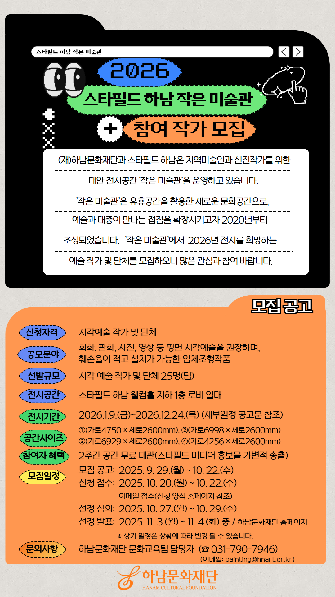 | [하남문화재단] 2026년도 스타필드 하남 「작은 미술관」 참여 작가 모집 (접수: 10.20.~10.22.) | |||