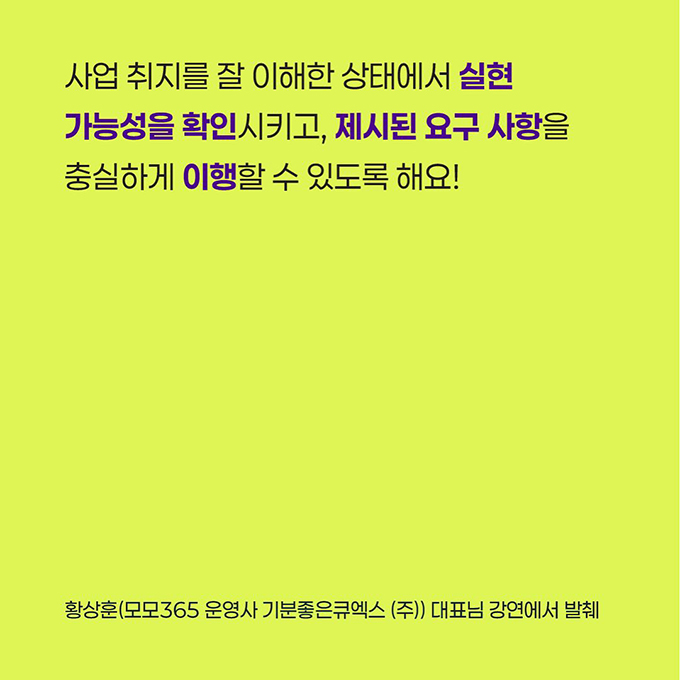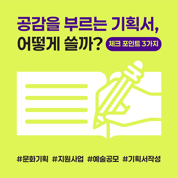쓰면서 어느 부분을 놓치고 있는지, 어디를 보완해야 할지 막막할 때가 있지 않으신가요? 그런 분들을 위해 준비한 모모365의 기획서 쓰기 카드 뉴스! 꾸준히 업로드될 계획이니 모모365 함께 기획서를 작성해 봐요! 문화예술지원사업부터