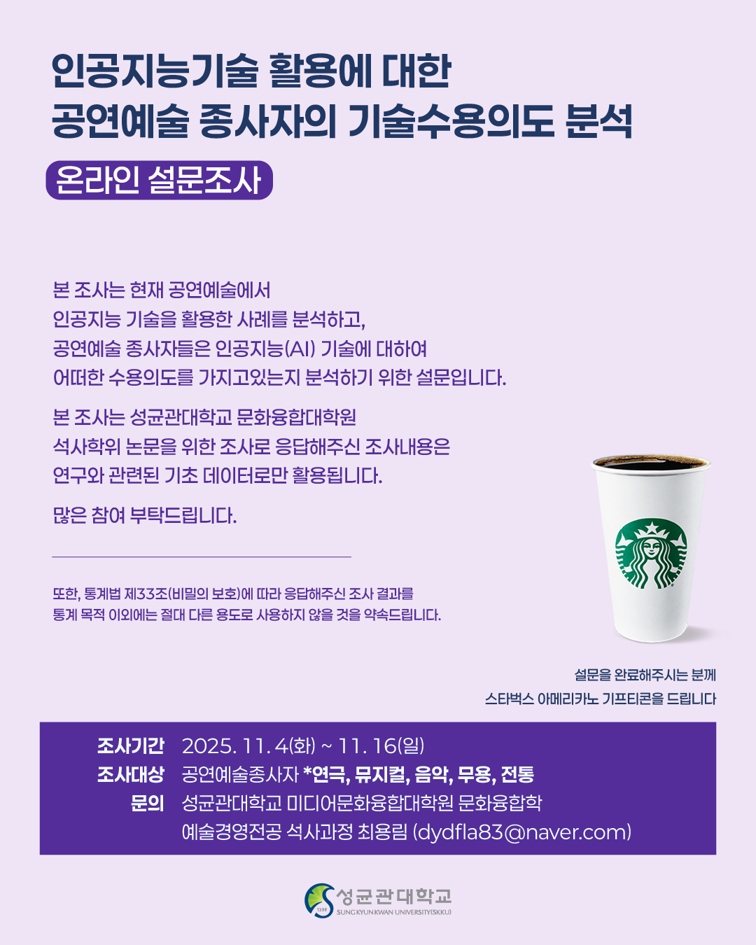 <아래의 내용은 히스토리 관리를 위해, 유지합니다> -------------------------------------------------------------------------------- 본 설문조사의 대상 적합성 등 설문응답에 대한 이슈가 발생하여, 응답을 임시적으로 종료하였습니다. 설문조사에 대한 재안내를 드릴 예정입니다. 양해를 부탁드립니다. ![]() 인공지능기술 활용에 대한 공연예술 종사자의 기술수용의도 분석에 관한 온라인 설문조사 참여자 모집의 글 본 조사는 현재 공연예술에서 인공지능 기술을 활용한 사례를 분석하고, 공연예술 종사자들은 인공지능(AI) 기술에 대하여 어떠한 수용의도를 가지고 있는지 분석하기 위한 설문입니다. 본 연구를 통해 인공지능 기술 수용에 대한 복합적인 양상과 집단별 특성을 입체적으로 분석하고 더 나아가 실질적인 정책 및 실무 지원 방안 마련에 기여하고자 하오니, 현업에 계신 종사자 입장에서 소중한 답변을 부탁드리겠습니다. 참여대상과 설문인원은 공연예술종사자(연극, 뮤지컬, 음악, 무용, 전통) 300명 입니다. 설문소요시간은 약 5~7분 내외이며, 각 문항에 대해 본인의 생각에 가장 가까운 응답을 체크해주시면 됩니다. 여러분의 귀한 목소리가 정책 개선을 위한 중요한 기초자료가 될 수 있도록, 잠시 시간을 내어 참여해 주시면 감사하겠습니다. 아래 [설문바로가기]를 클릭하시거나,