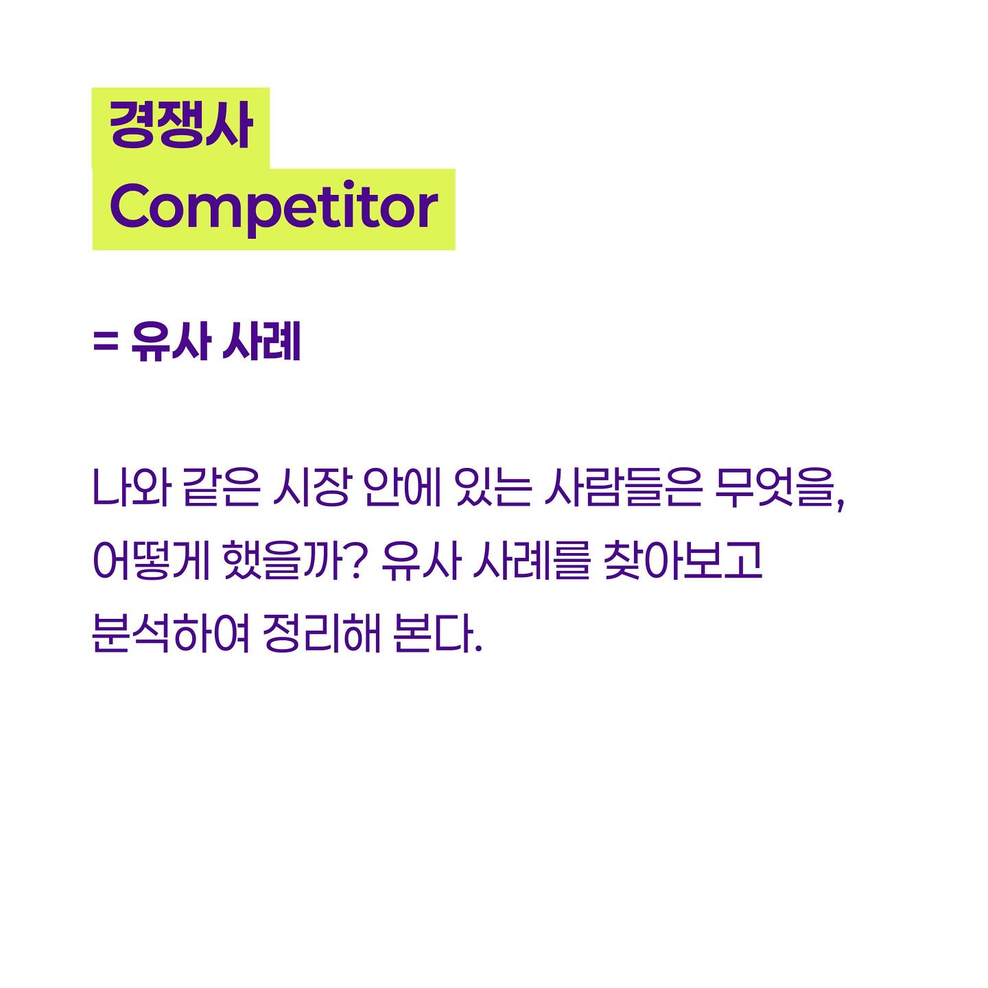 2. 경쟁사 Competitor 유사사례 나와 같은 시장 안에 있는 사람들은 무엇을 어떻게 했을까? 유사 사례를 찾아보고 분석하여 정리한다.