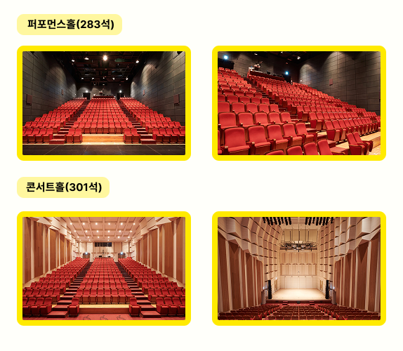 ○ 제출서류 - 기본신청서 [필수] (대관시스템에 입력) - 공연계획서 [필수] (대관시스템에 입력) - 기타 증명서류 및 확인서 등 [선택] (대관시스템 - 공연계획서 - 첨부파일로 업로드) ※ 기본신청서 작성 후 공연계획서 입력(제출)을 반드시 해주시기 바랍니다. ○ 대관시설 : 퍼포먼스홀(283석) / 콘서트홀(301석)