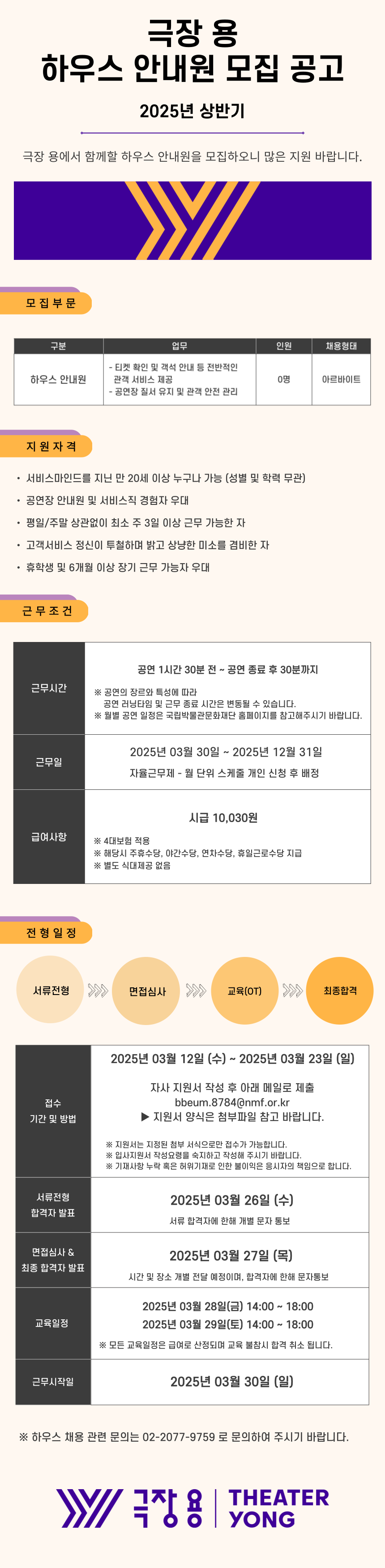 [국립박물관문화재단] 2025년 상반기 극장 용 공연장 안내원 모집공고 (~3/23)