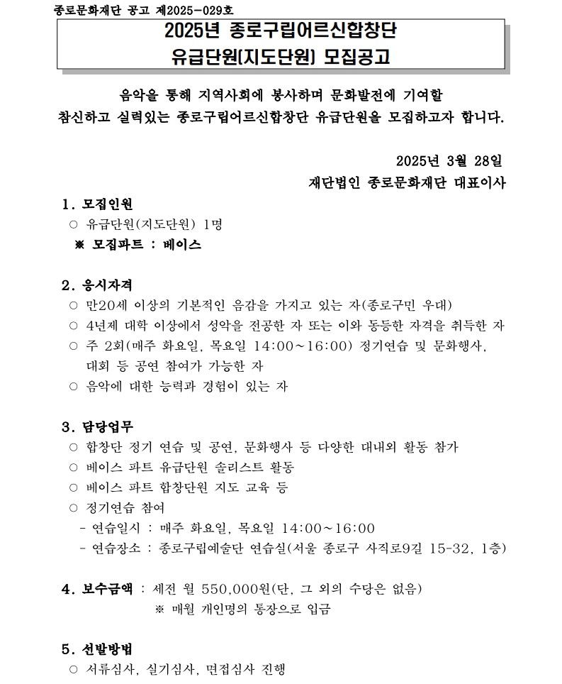 [재단법인 종로문화재단] 2025년 종로구립어르신합창단 유급단원(지도단원: 베이스) 모집