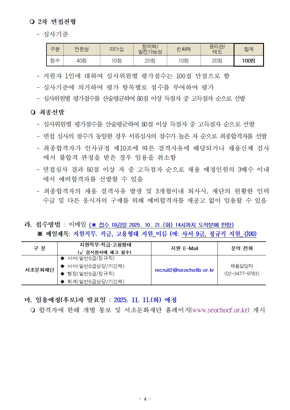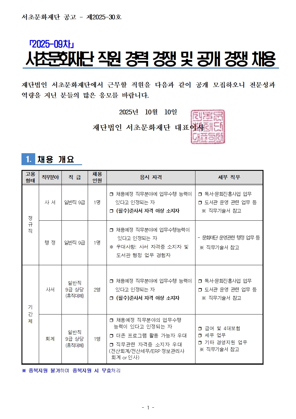 [(재)서초문화재단] 2025-09차 서초문화재단 직원 채용 공고