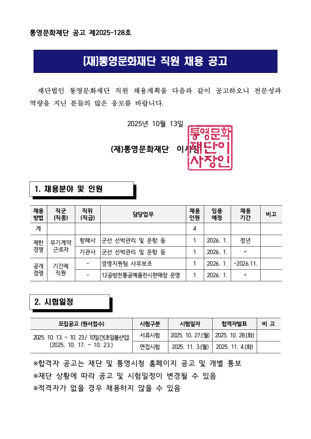 [(재)통영문화재단] (재)통영문화재단 직원 채용 공고