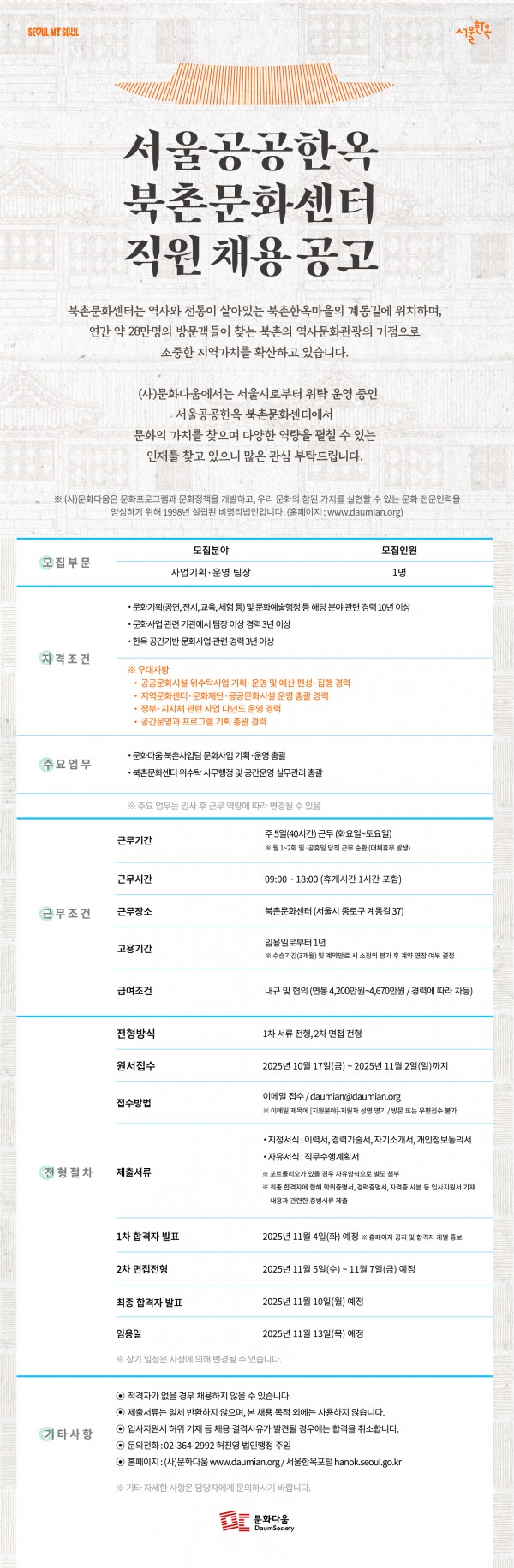 [(사)문화다움] [문화다움] 서울 공공한옥 북촌문화센터 직원 채용 공고(사업기획·운영 팀장)