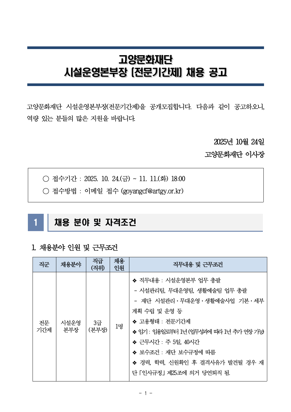 [고양문화재단] 2025년 고양문화재단 시설운영본부장(전문기간제) 채용 공고(안)
