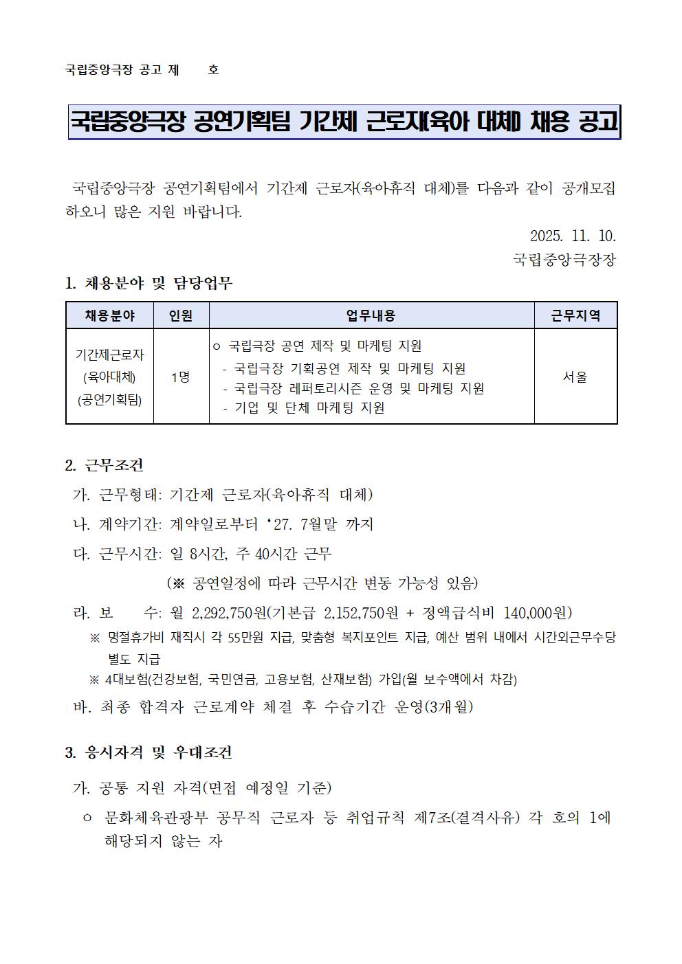 [국립극장] 국립극장 공연기획팀 기간제근로자(육아대체) 채용 공고