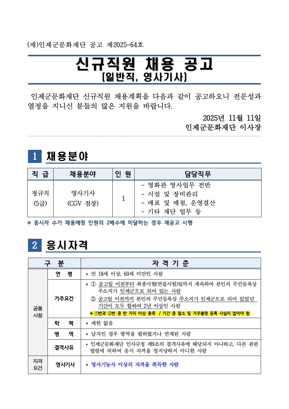 [(재)인제군문화재단] (재)인제군문화재단 신규직원 채용 공고(영사기사)