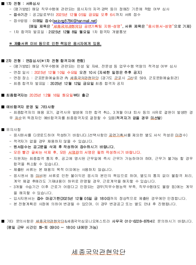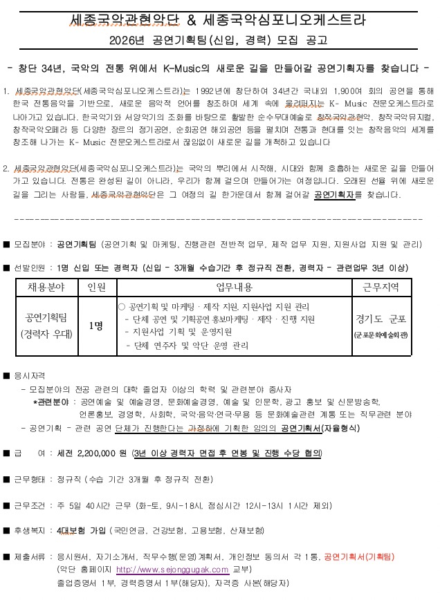 [세종국악관현악단] 세종국악관현악단&세종국악심포니오케스트라 2026년 공연기획팀 기획자(신입 및 경력자) 모집 공고