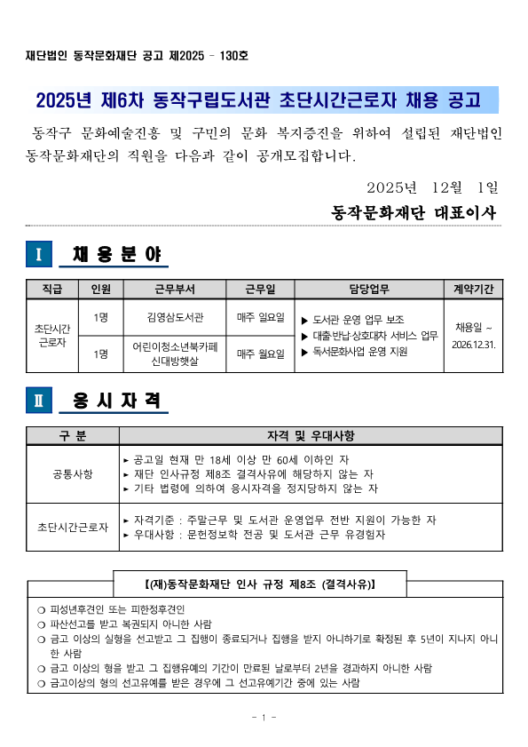 [(재)동작문화재단] 2025년 제6차 동작구립도서관 초단시간근로자 채용 공고