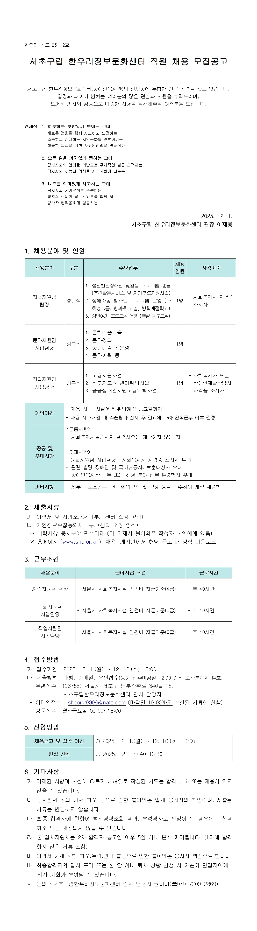 [서초구립 한우리정보문화센터] 서초구립한우리정보문화센터(장애인복지관) 문화사업담당 채용