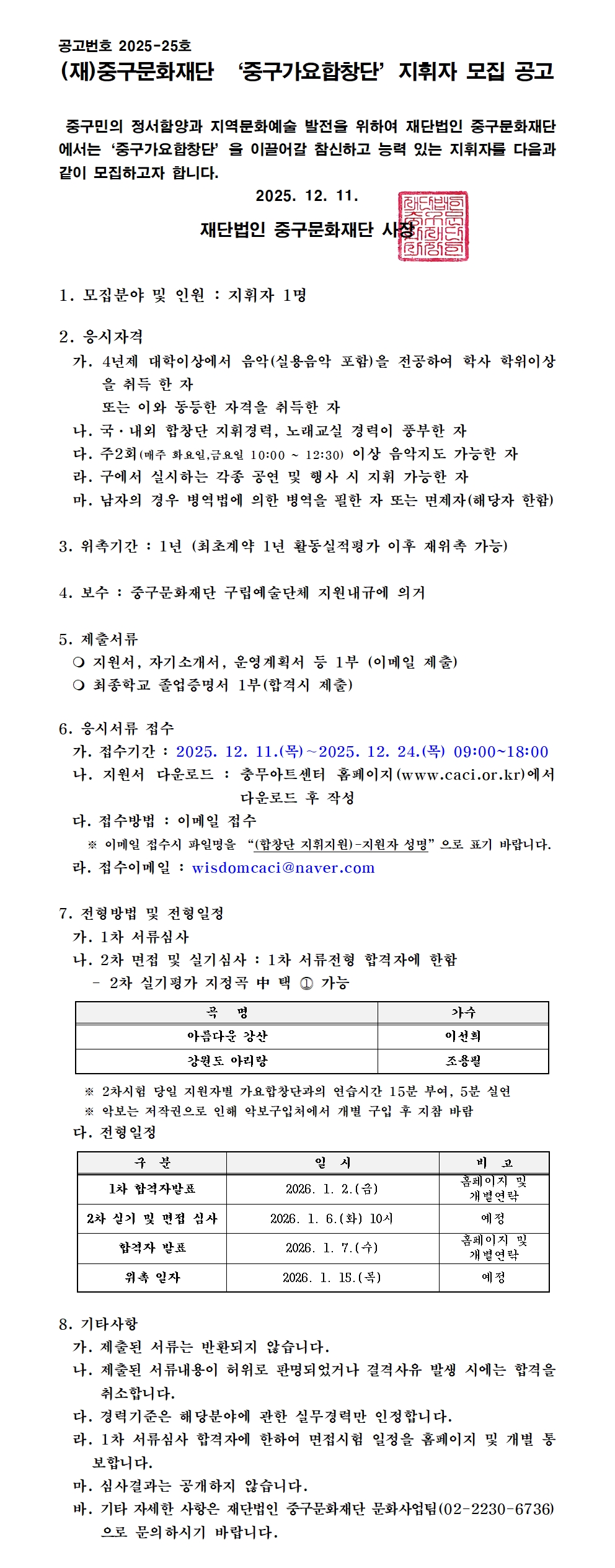 [재단법인중구문화재단] [충무아트센터] 중구가요합창단 지휘자 모집 공고(~12.24. 18:00 까지 이메일 지원 접수)