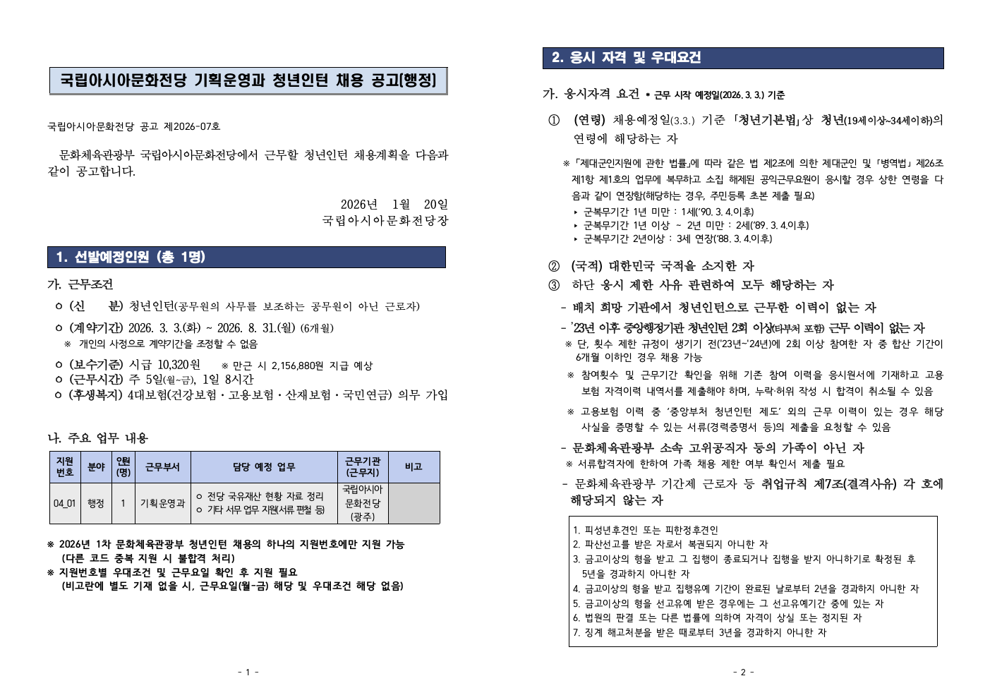 [국립아시아문화전당 ] 국립아시아문화전당 기획운영과 청년인턴 채용 공고(행정)