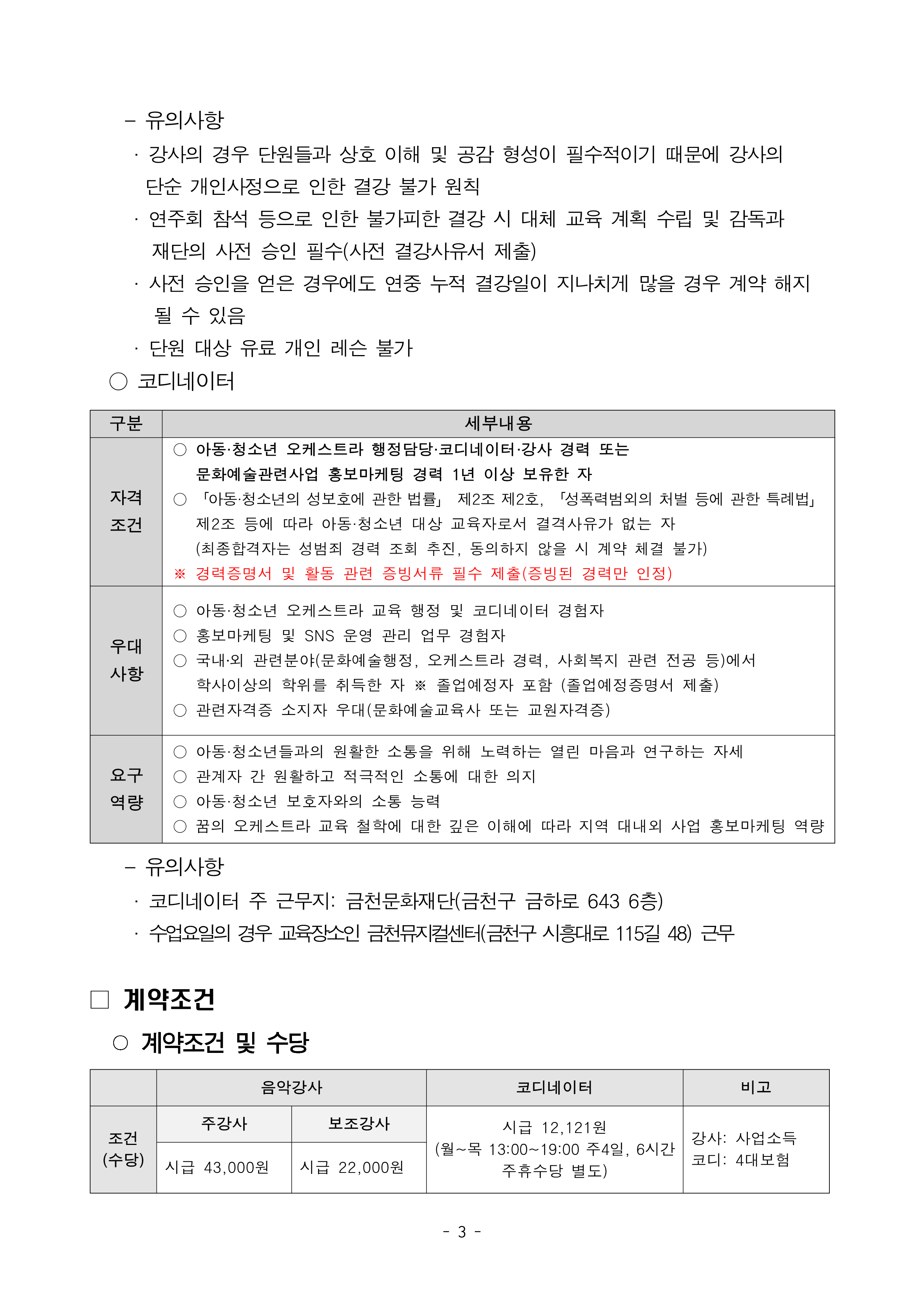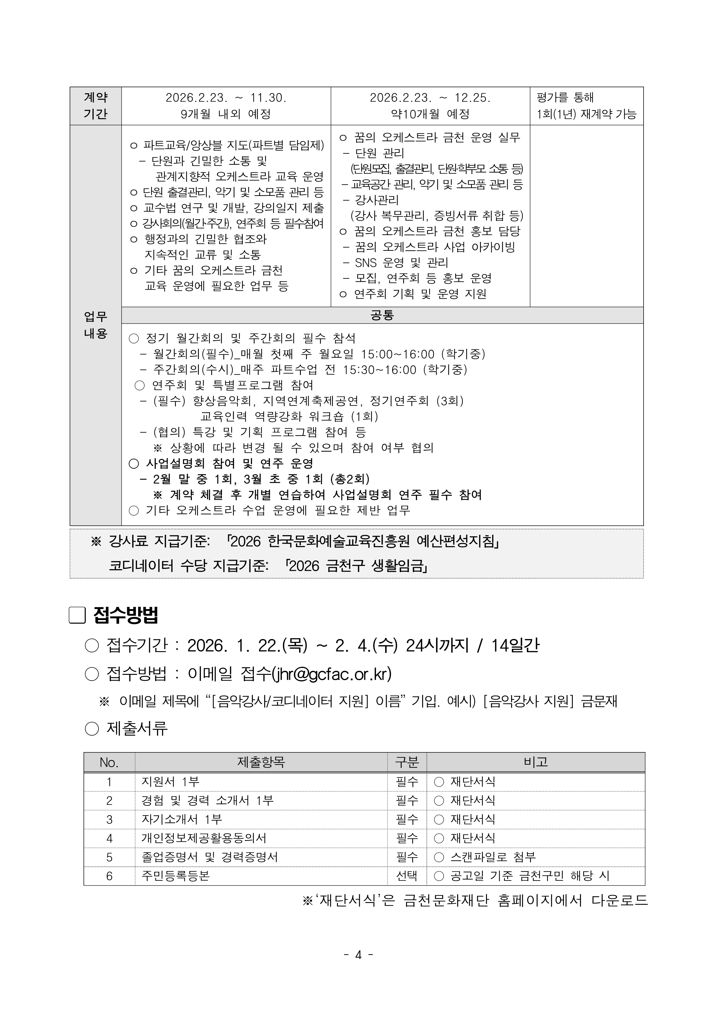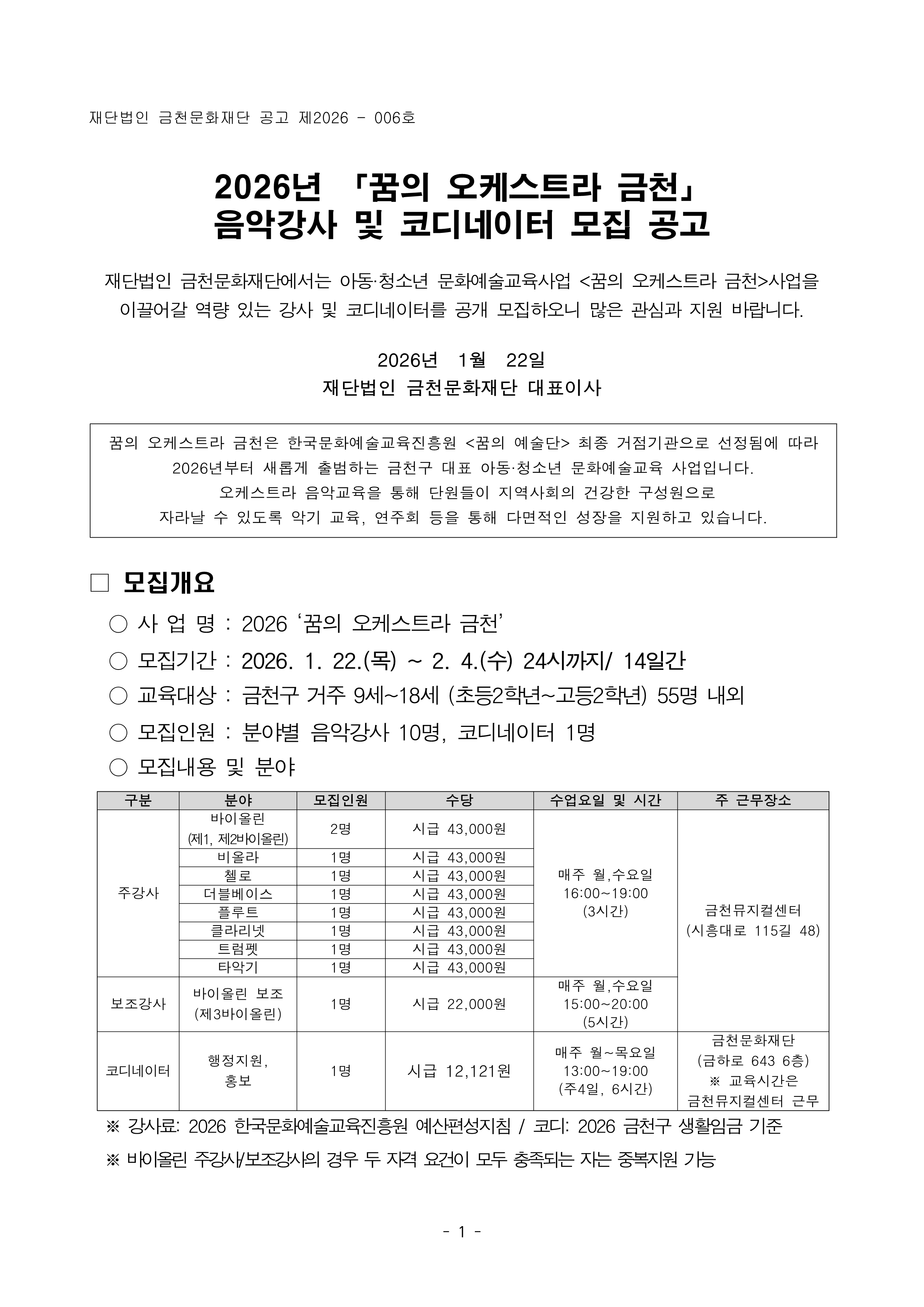 [(재)금천문화재단] [회원등록공고] 2026 '꿈의 오케스트라 금천' 음악강사 및 코디네이터 공개 모집