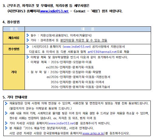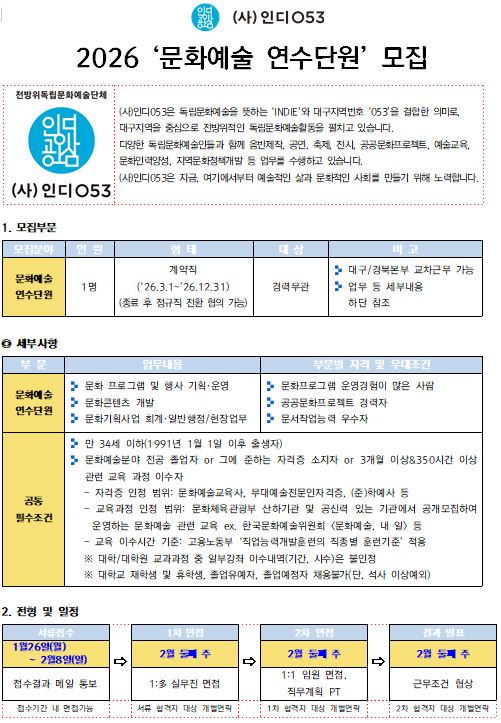 [사단법인 인디053] [회원등록공고] 2026 예술기반 청년일자리 연수단원 채용 (사단법인 인디053)