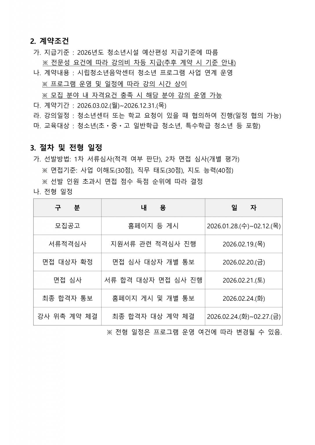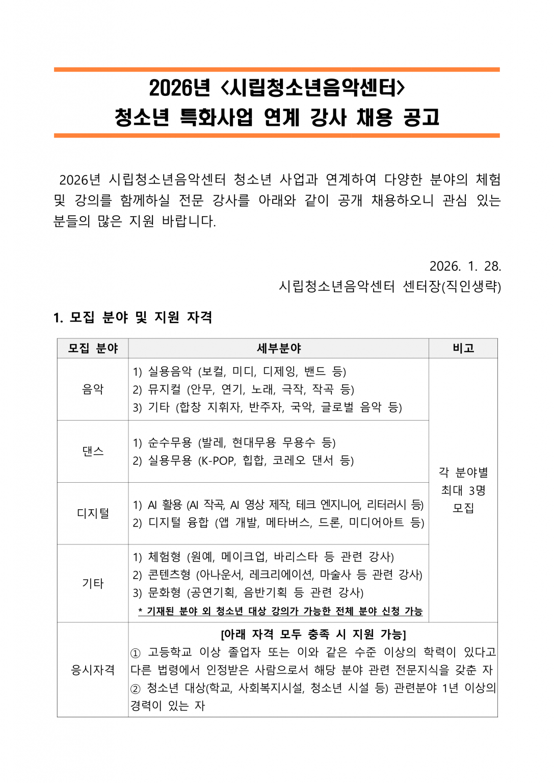 [시립양천청소년음악창작센터] 2026년 시립청소년음악센터 청소년 특화사업 연계 강사 채용 공고