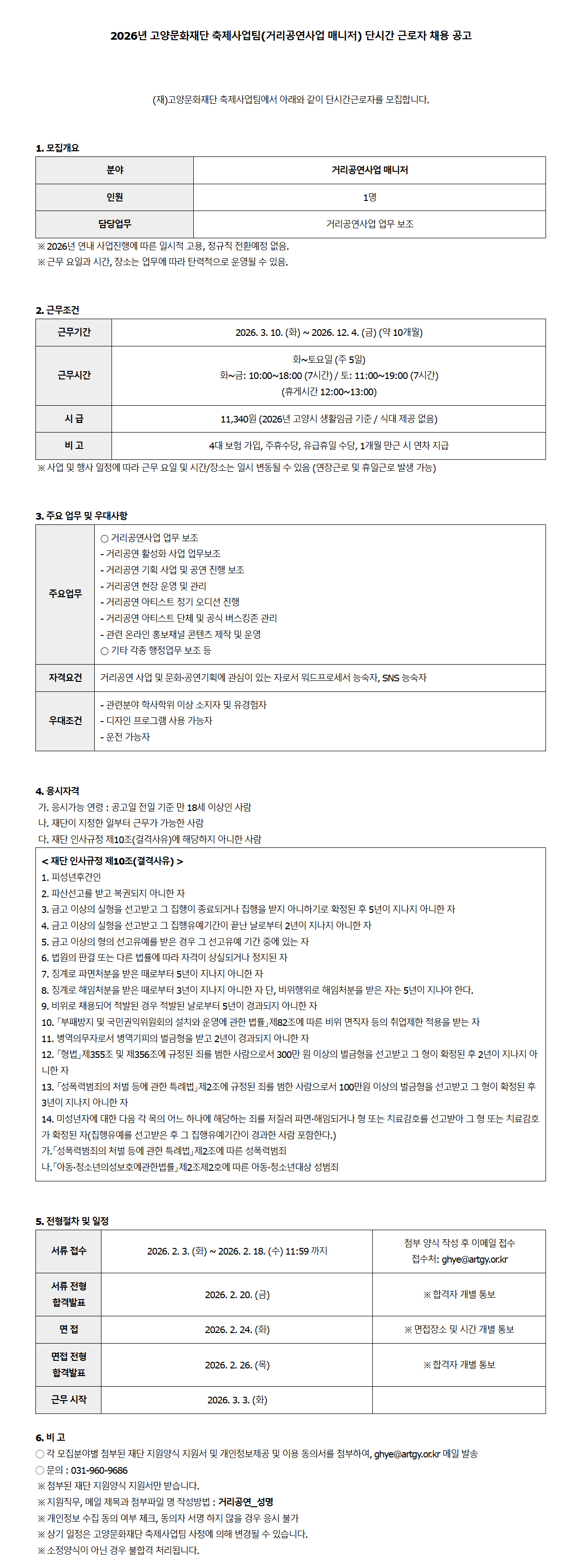 [고양문화재단] 2026년 고양문화재단 축제사업팀(거리공연사업 매니저) 단시간 근로자 채용 공고