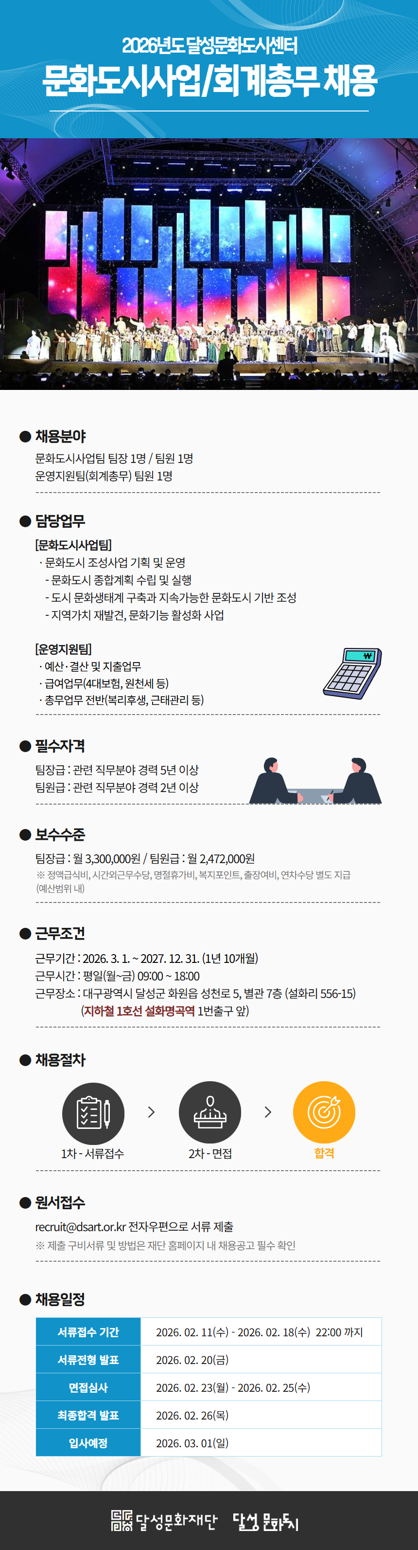 [달성문화재단] 달성문화도시센터 문화도시사업팀장, 팀원 및 회계총무 팀원 채용공고