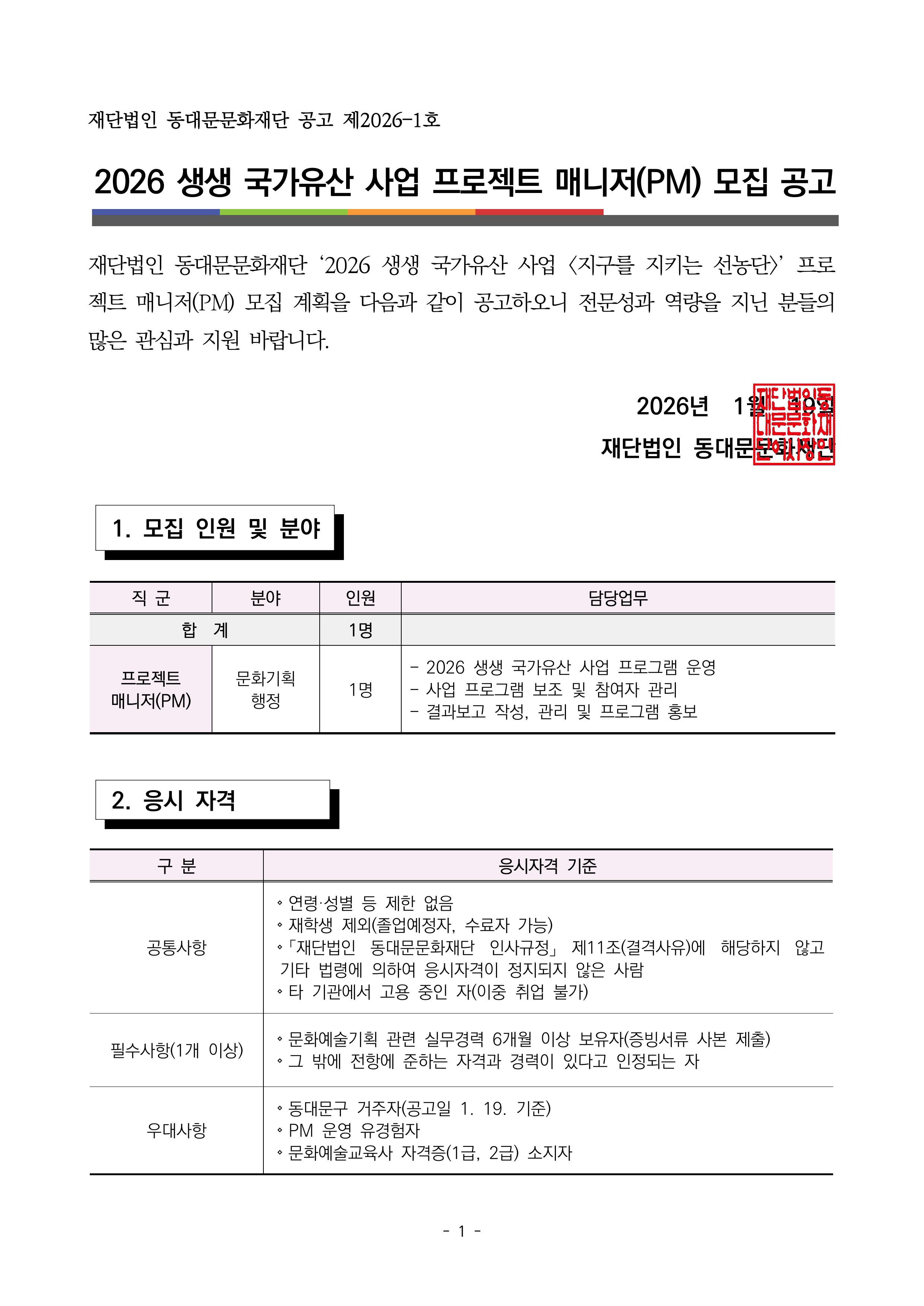 [(재)동대문문화재단] 2026 생생 국가유산 사업 프로젝트 매니저(PM) 모집 공고
