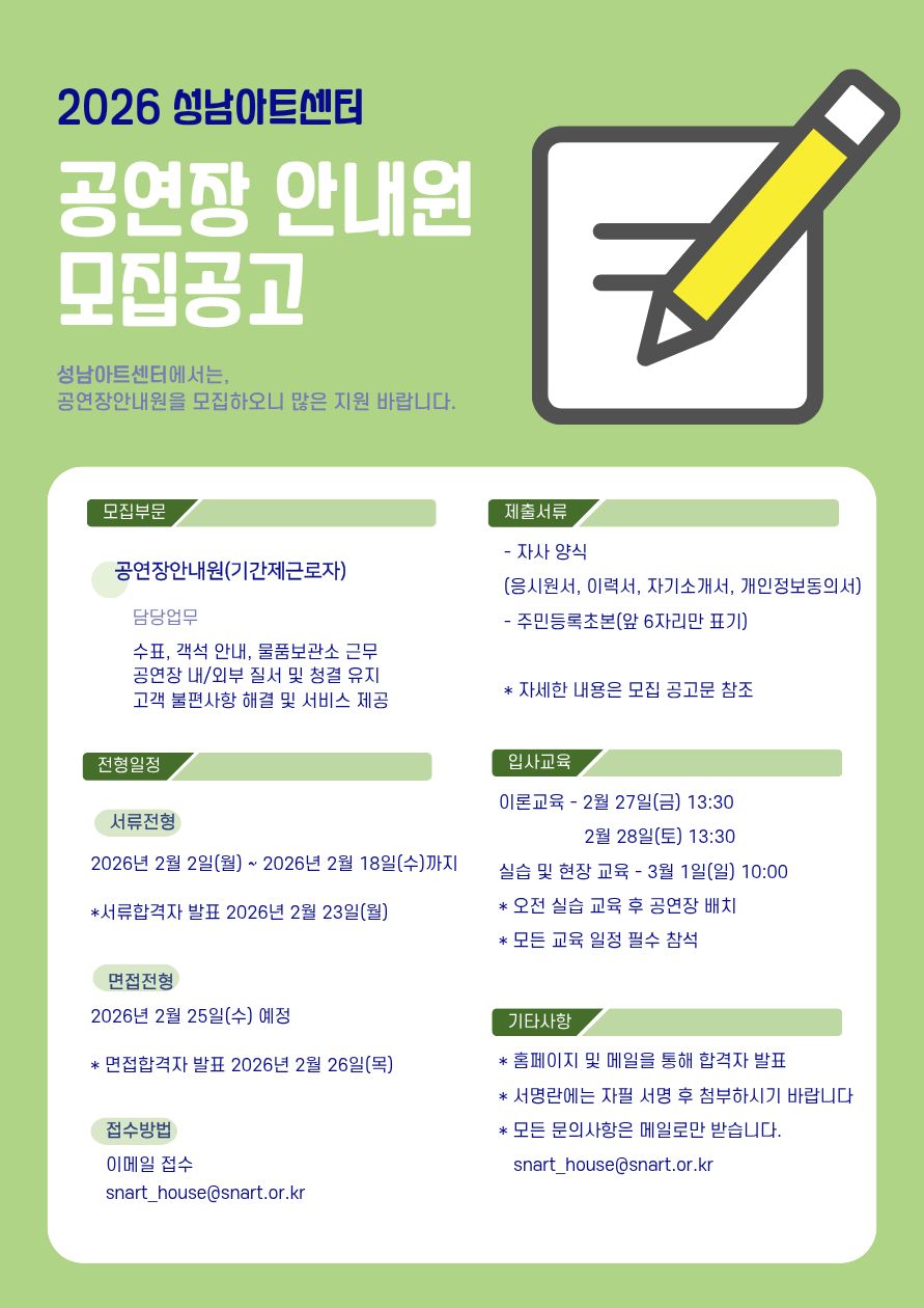 [성남문화재단] 2026 성남아트센터 공연장안내원 모집공고 (~2/18)