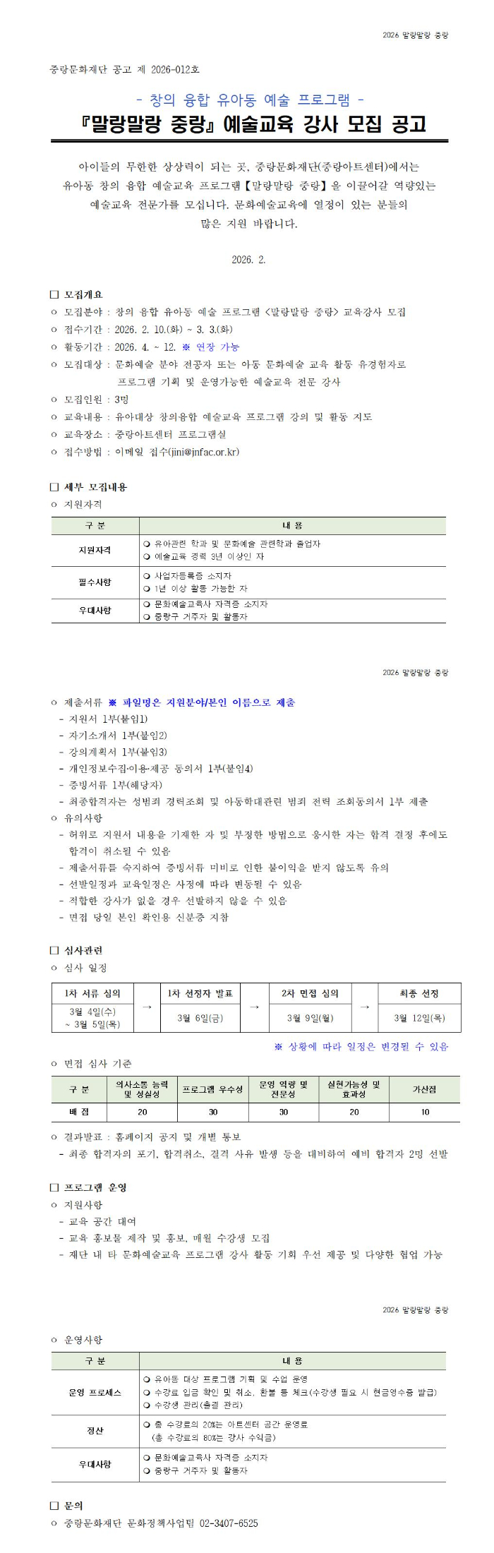 [중랑문화재단(중랑아트센터)] [회원등록공고] 창의 융합 유아동 예술 프로그램 <말랑말랑 중랑> 예술교육 강사 모집 공고