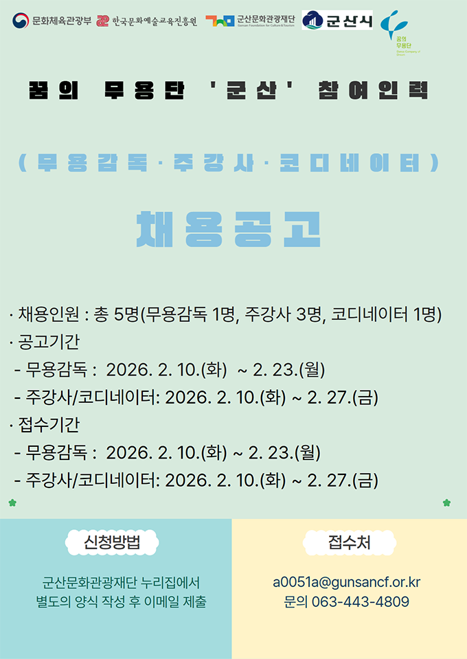(재)군산문화관광재단에서 자립 거점화를 향한 새로운 도약을 함께할 무용감독, 주강사, 코디네이터를 모집합니다!