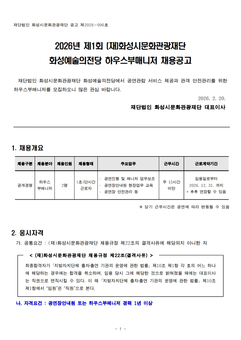 [재단법인 화성시문화재단] 2026년 제1회 (재)화성시문화관광재단 화성예술의전당 하우스부매니저 채용공고 (~3/3)