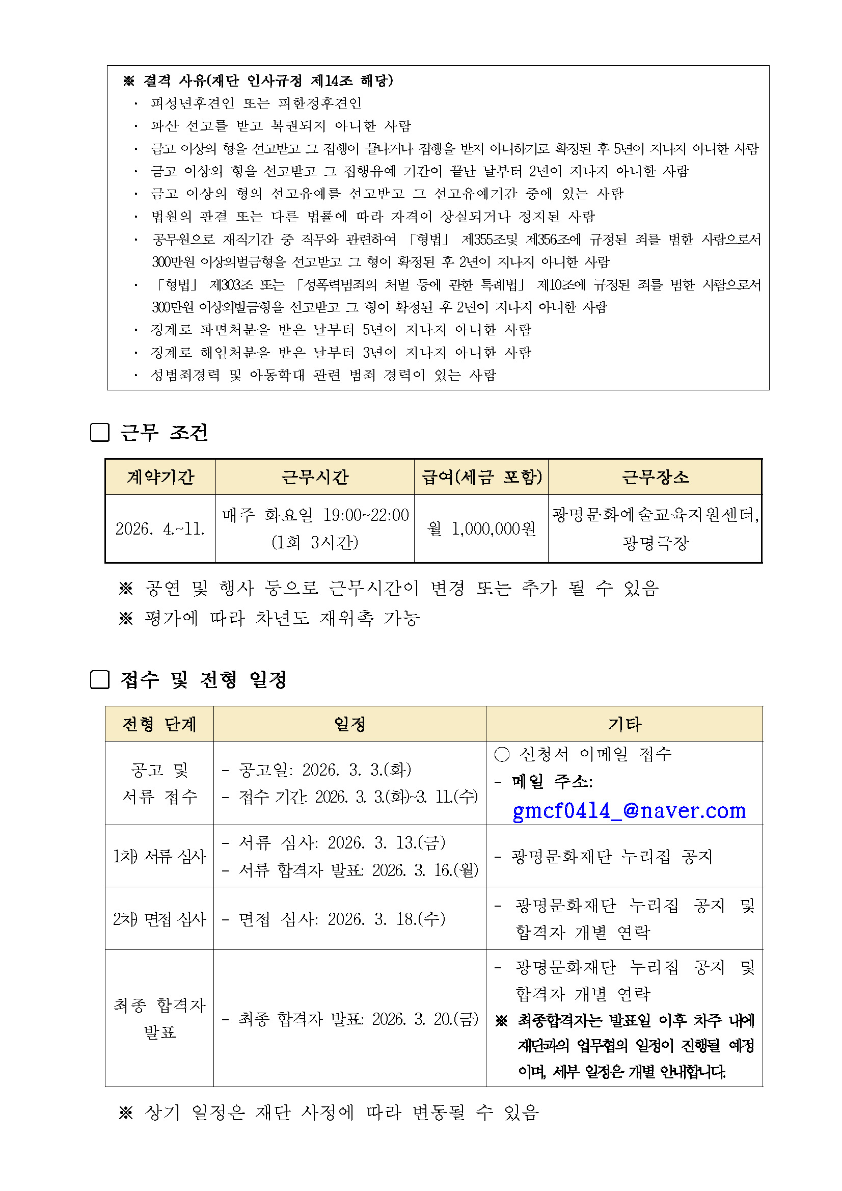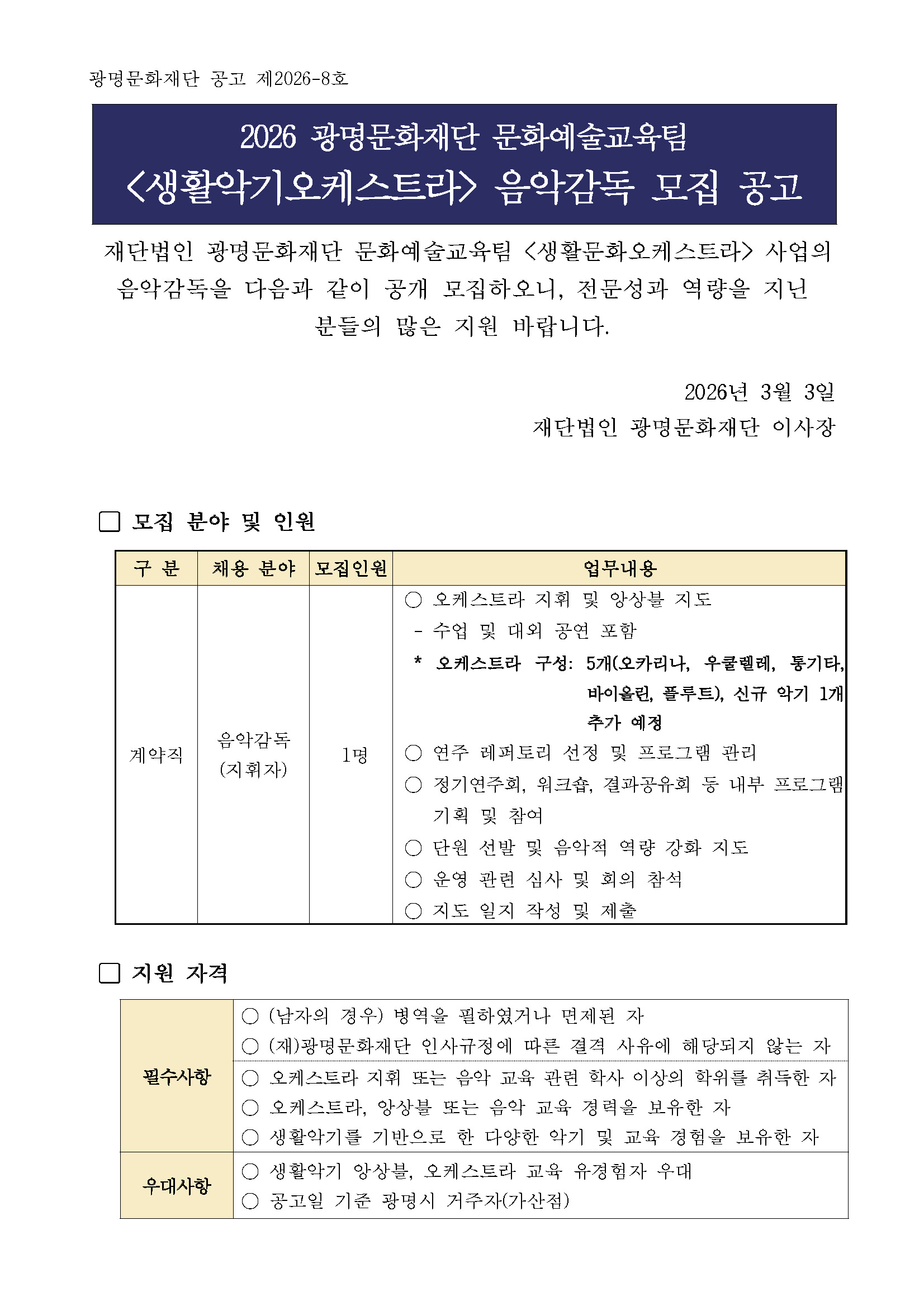 [아트모아] 2026 (재)광명문화재단 문화예술교육팀 음악감독 모집 공고