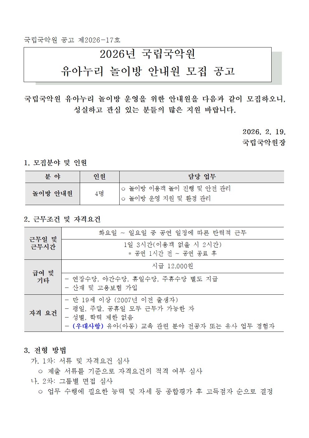 [국립국악원] (복사) 2026년 국립국악원 놀이방 안내원 모집