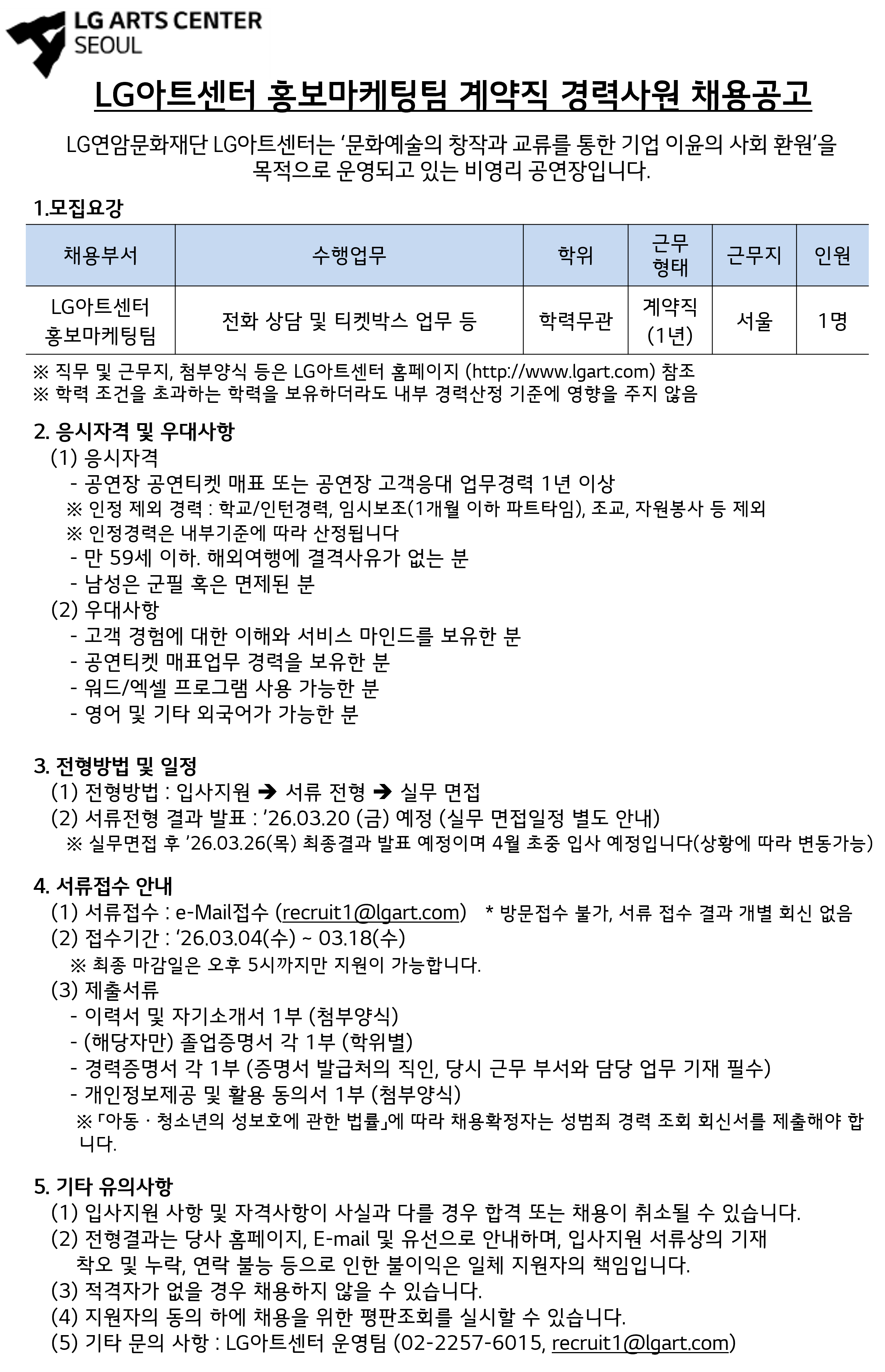 [엘지연암문화재단] LG아트센터 홍보마케팅팀(티켓박스) 계약직 경력사원 채용공고