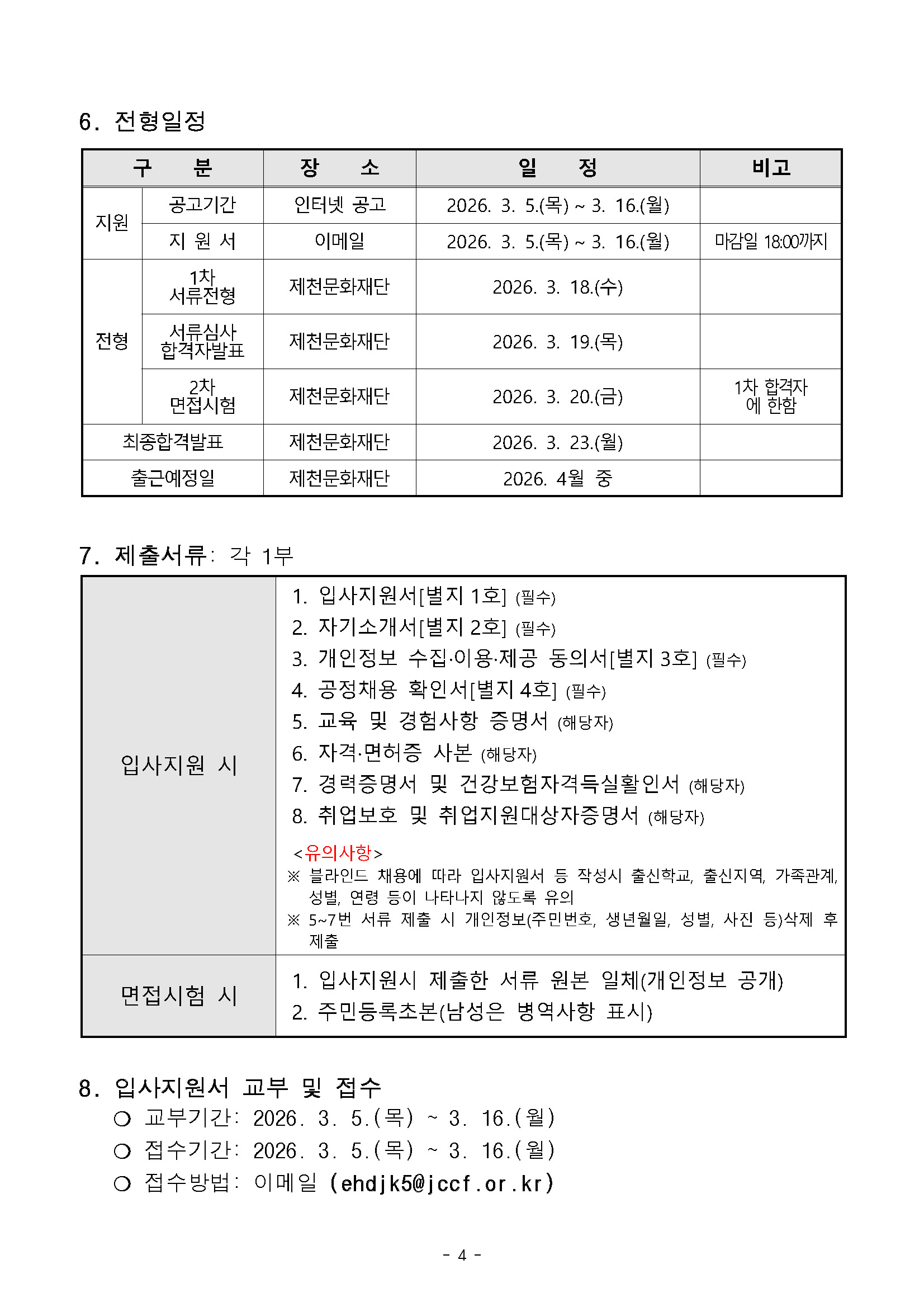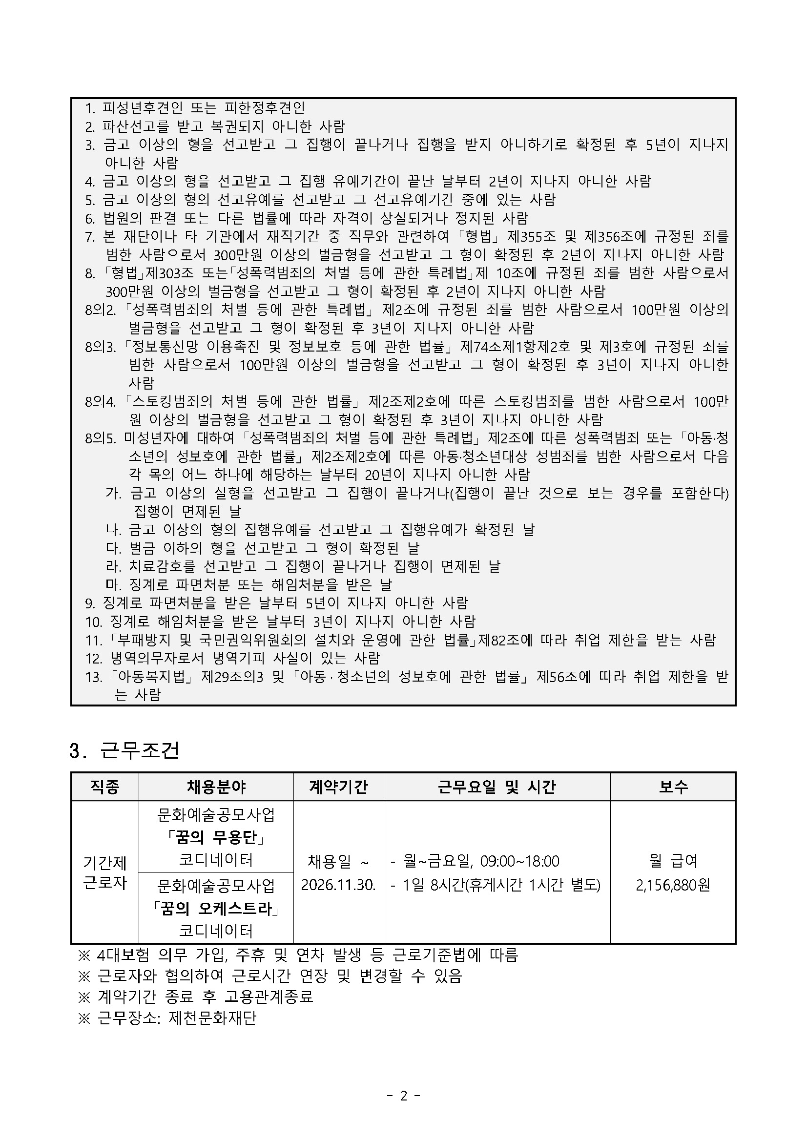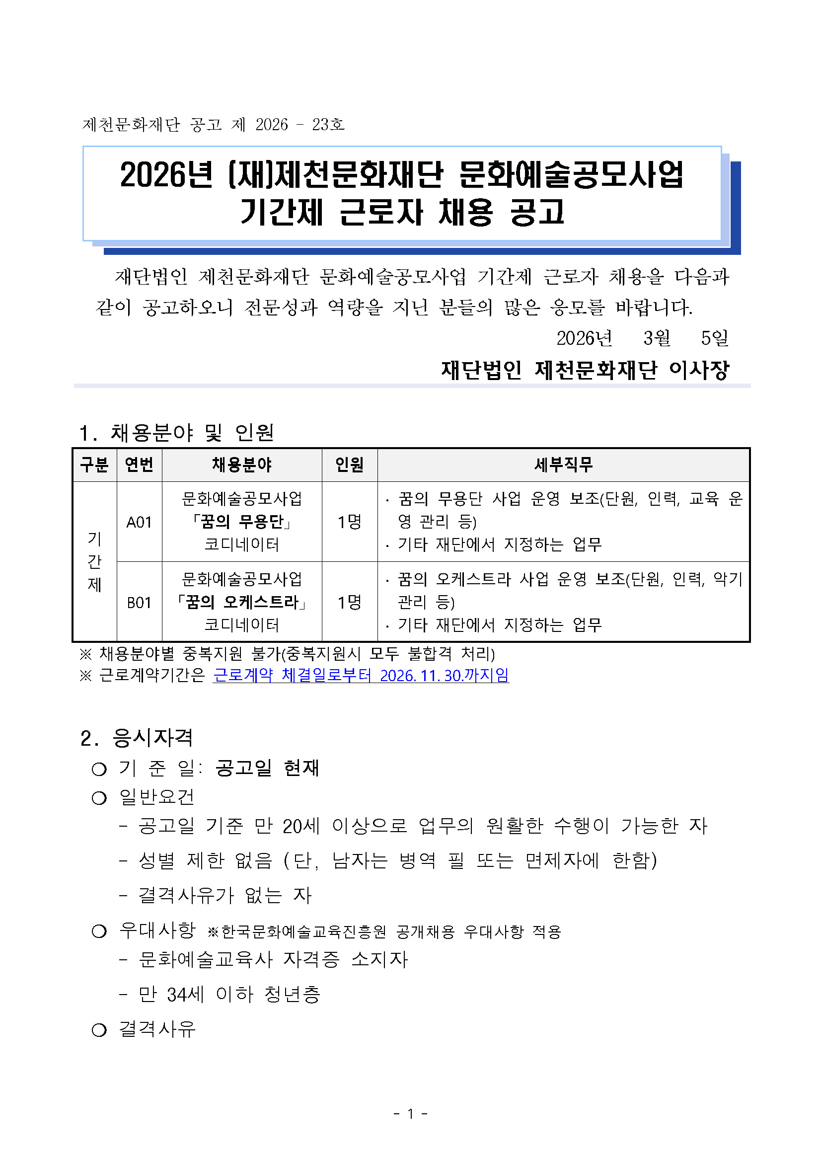 [재단법인 제천문화재단] 2026년 (재)제천문화재단 문화예술공모사업 기간제 근로자 채용 공고