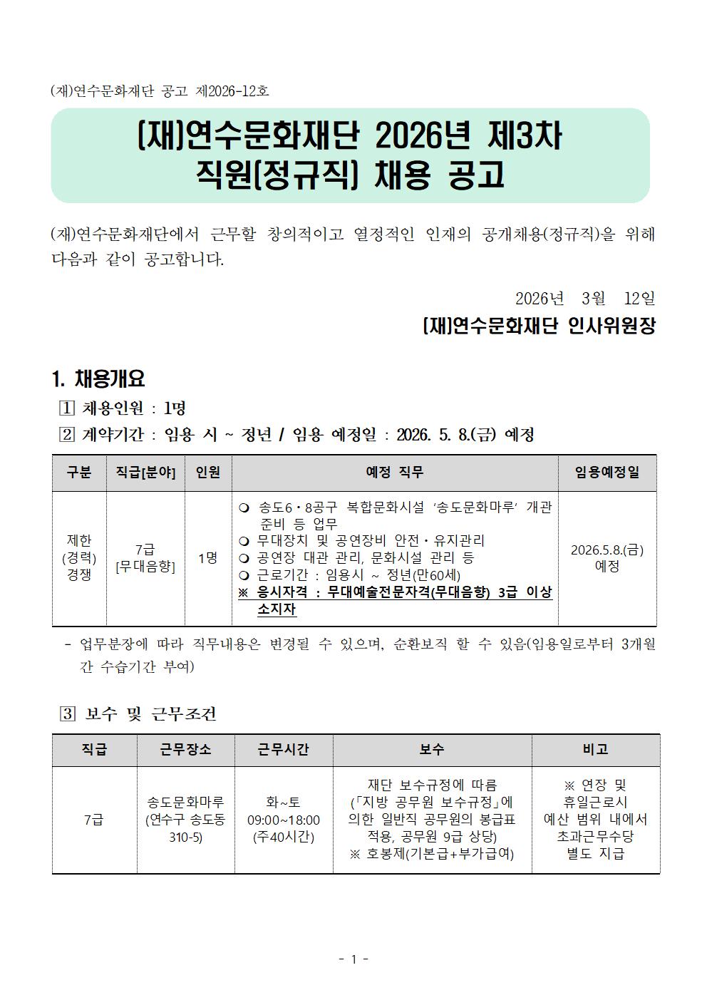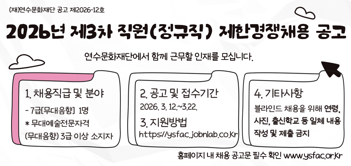 [(재)연수문화재단] (재)연수문화재단 2026년 제3차 직원(정규직) 채용 공고