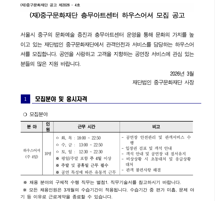 (재)중구문화재단 충무아트센터 하우스매니저(기간제) 채용공고 (~4/24)