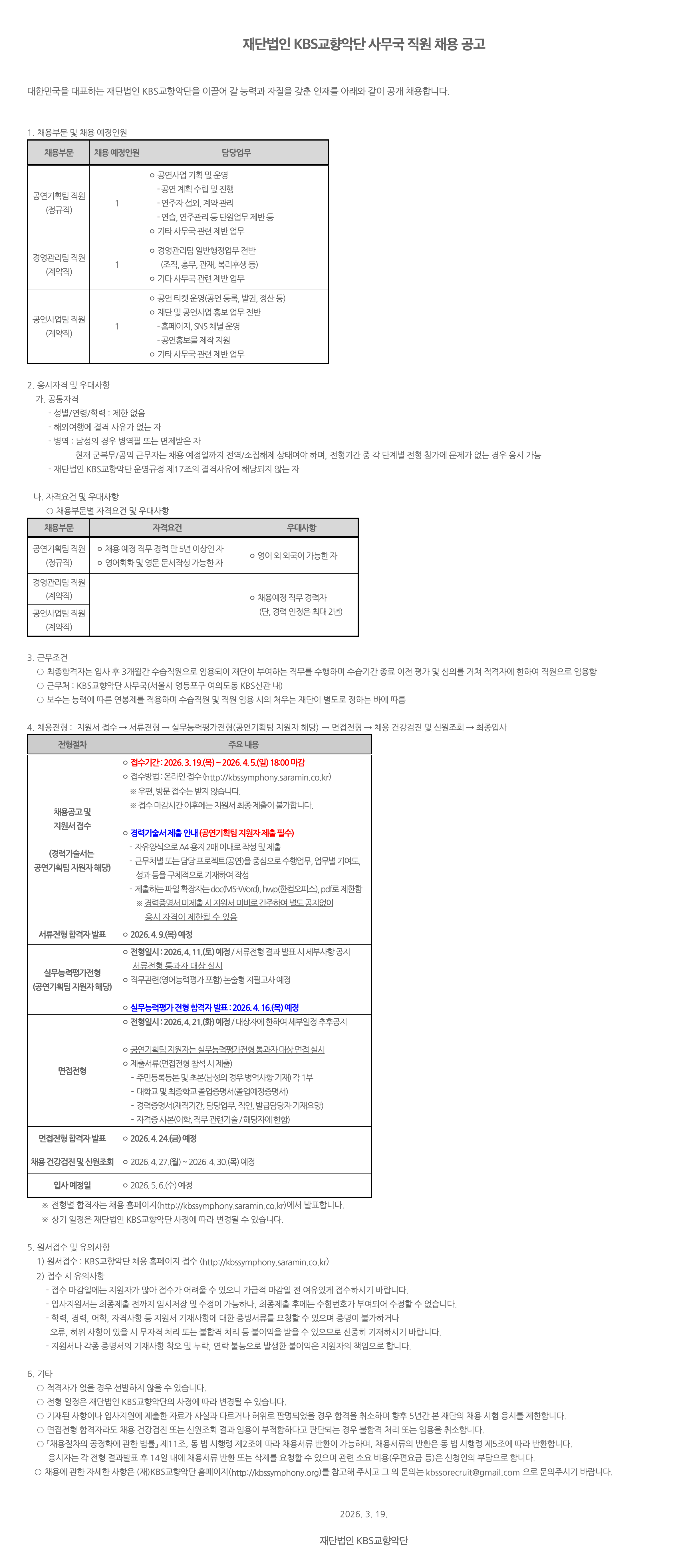 [재단법인KBS교향악단] 2026년 재단법인 KBS교향악단 사무국 직원 채용