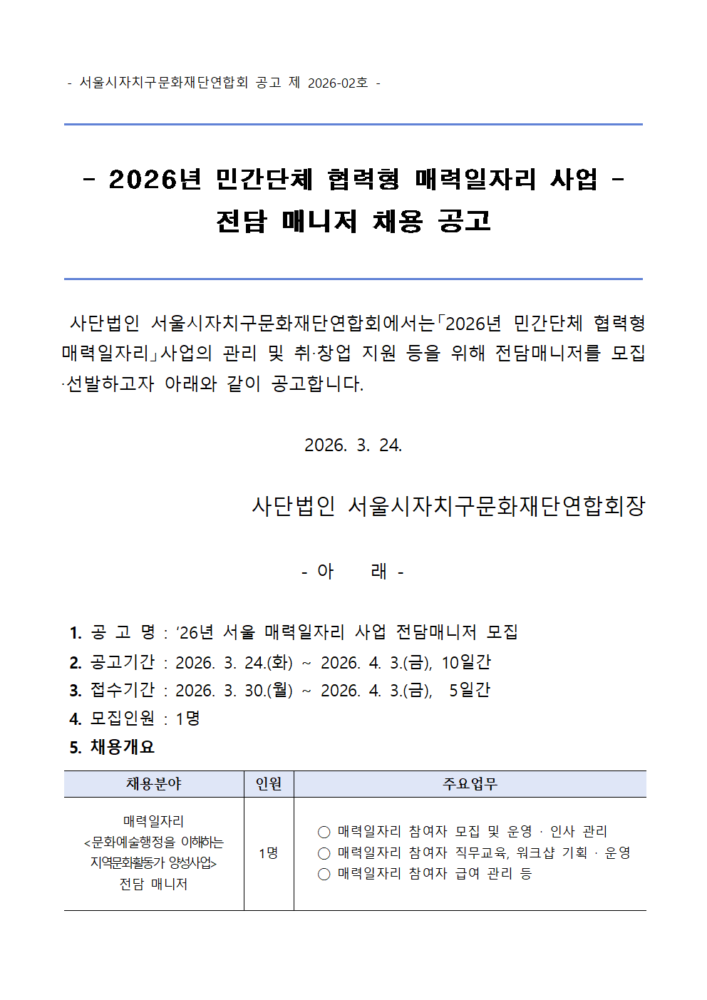 [서울시자치구문화재단연합회] 2026년 민간단체협력형 매력일자리 사업 전담매니저 채용공고