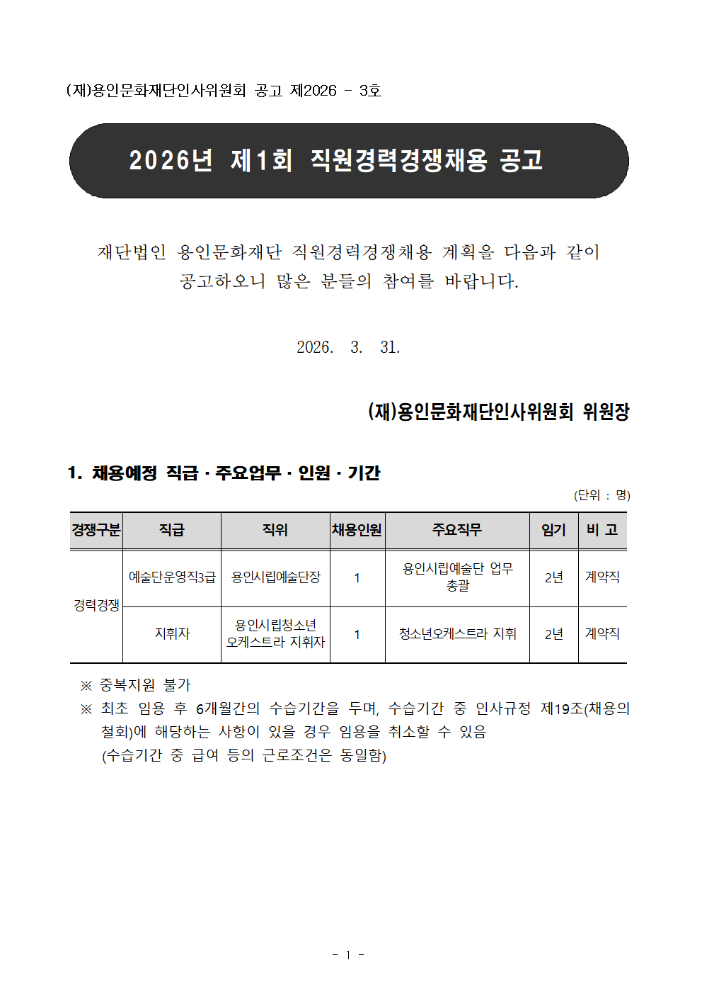 [(재)용인문화재단] 용인문화재단 2026년 제1회 직원경력경쟁채용 공고