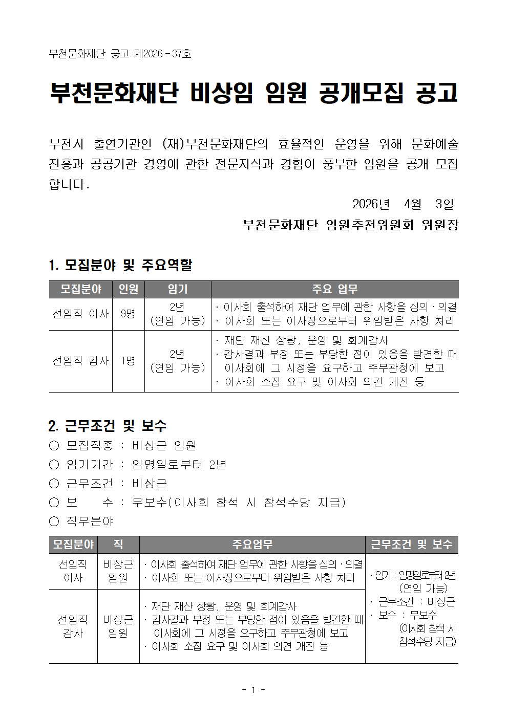 20260407071623_[공고 제2026-37호] 부천문화재단 비상임 임원(이사 및 감사) 공개모집 공고문.hwp