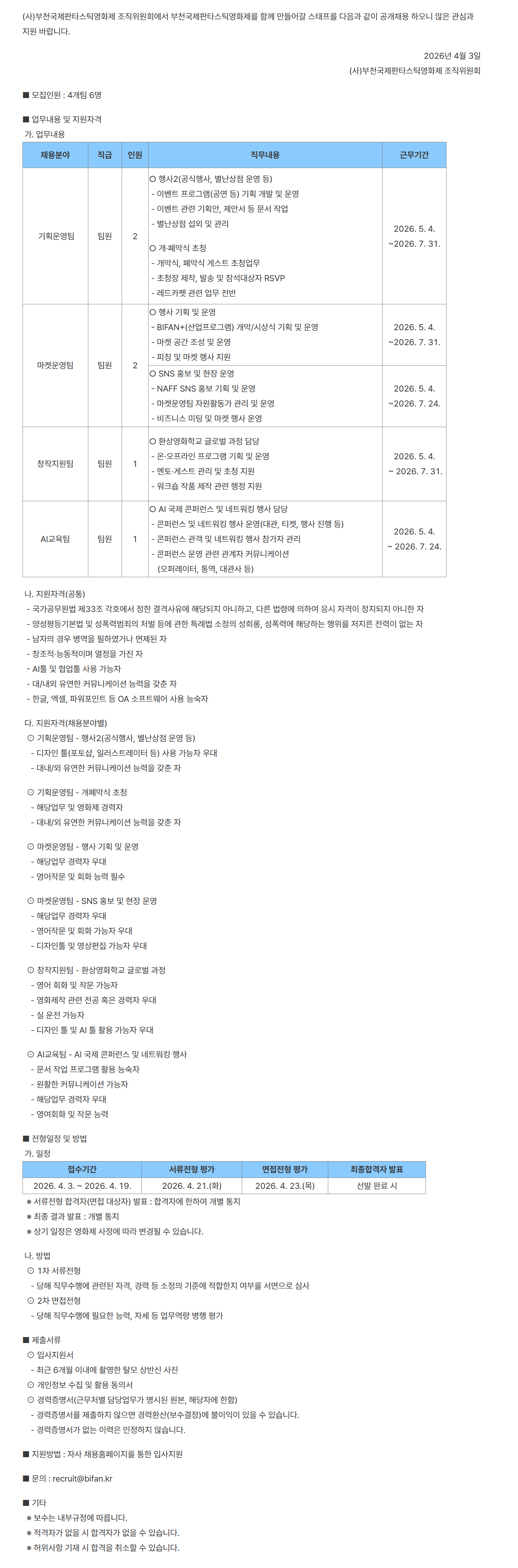 부천국제판타스틱영화제 채용 2차(프로그램팀, AI교육팀, 기술팀, 뉴미디어팀, 기획운영팀, 온라인팀)