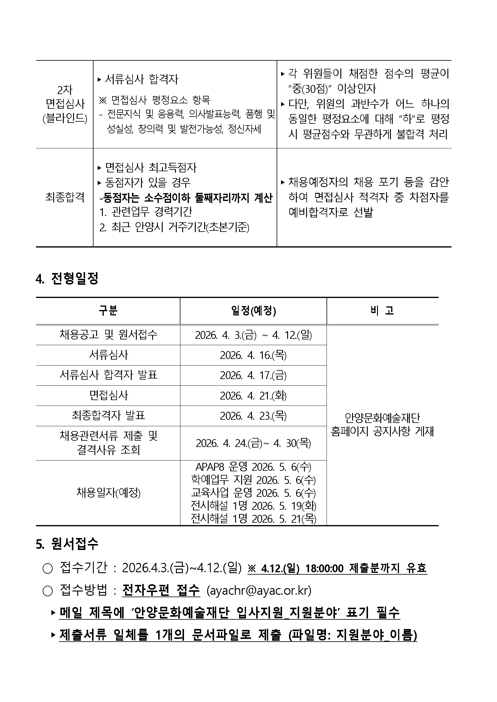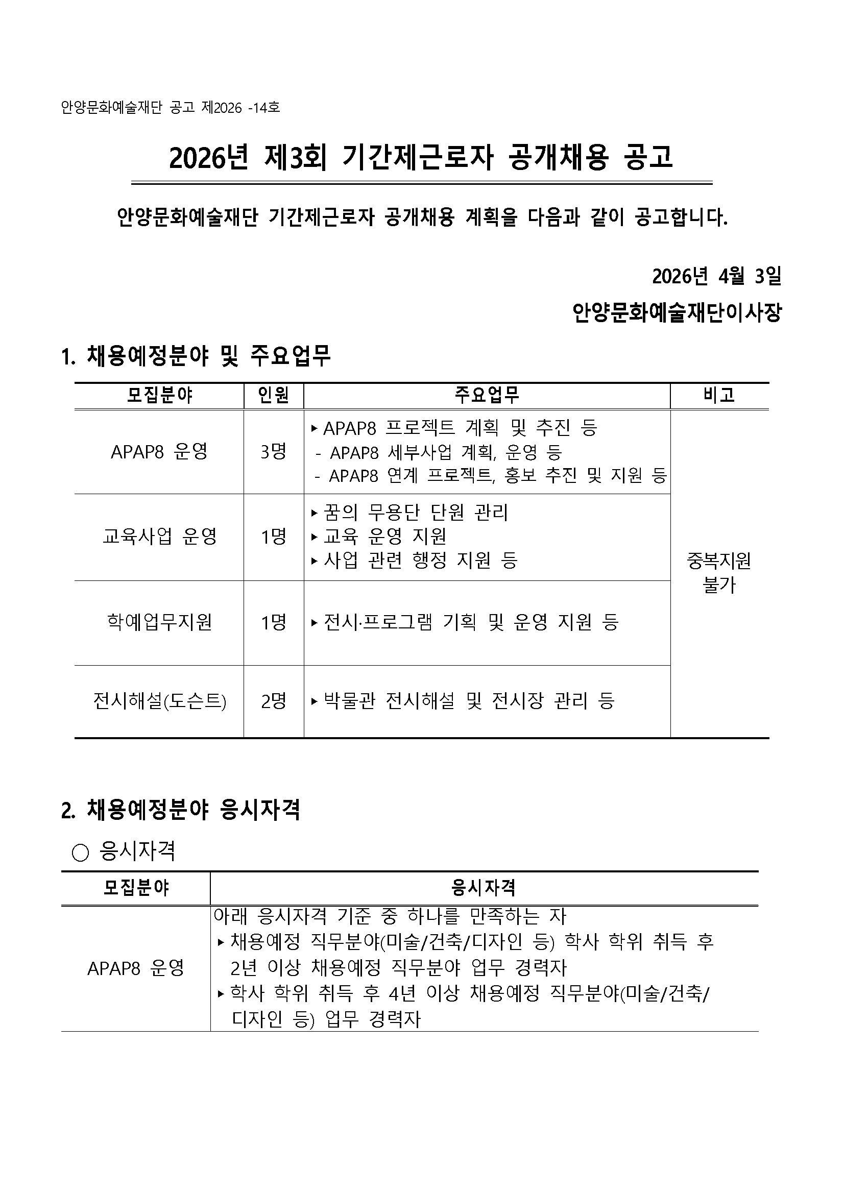 [안양문화예술재단 ] 2026년 제3회 기간제근로자 공개채용 공고
