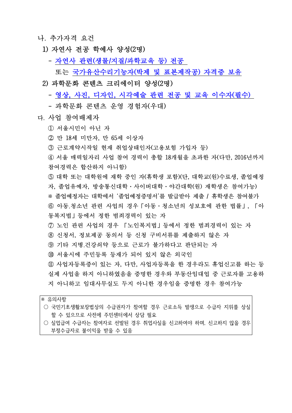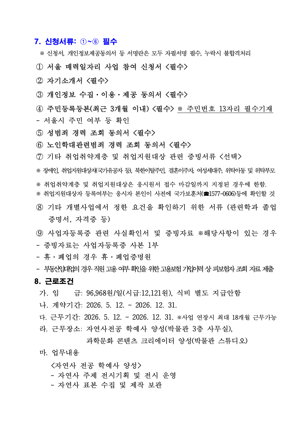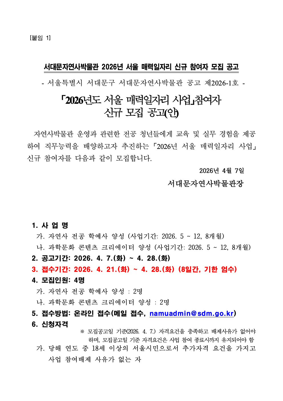 [서대문자연사박물관] 서대문자연사박물관 2026년 서울 매력일자리(과학문화 콘텐츠 크리에이터 양성) 참여자 모집