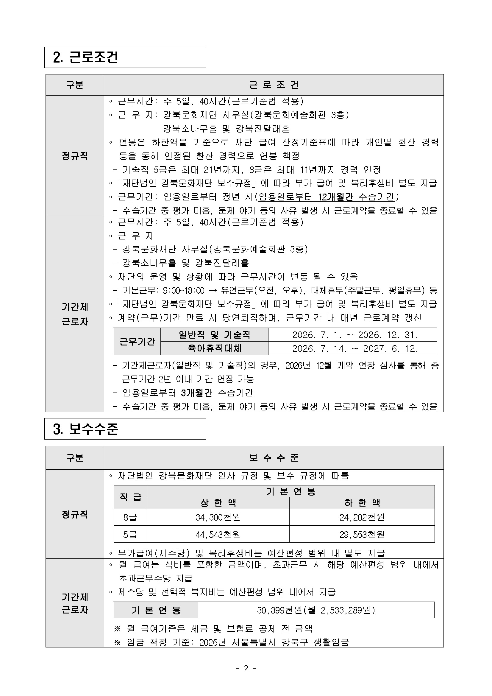 [재단법인 강북문화재단] [재]강북문화재단 2026년 제2차 정규직 및 기간제근로자 공개채용 공고