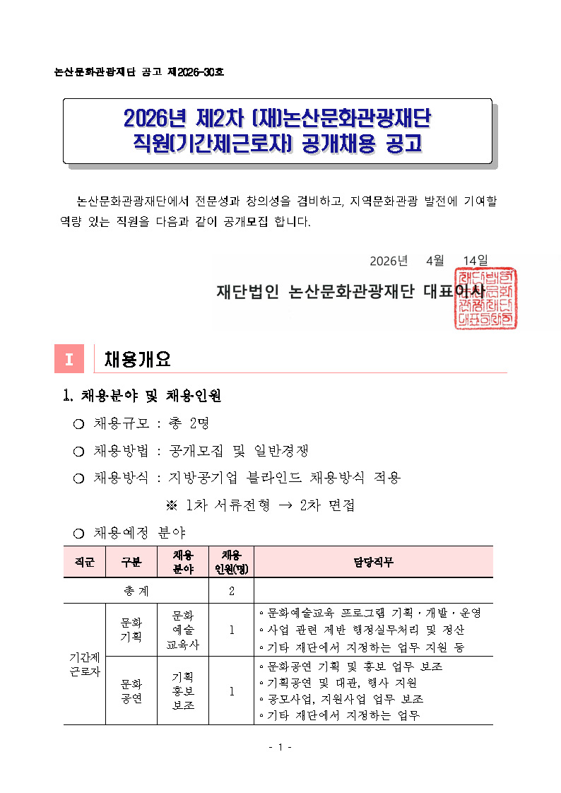 [논산문화관광재단] 2026년 제2차 (재)논산문화관광재단 직원(기간제근로자) 공개채용 공고